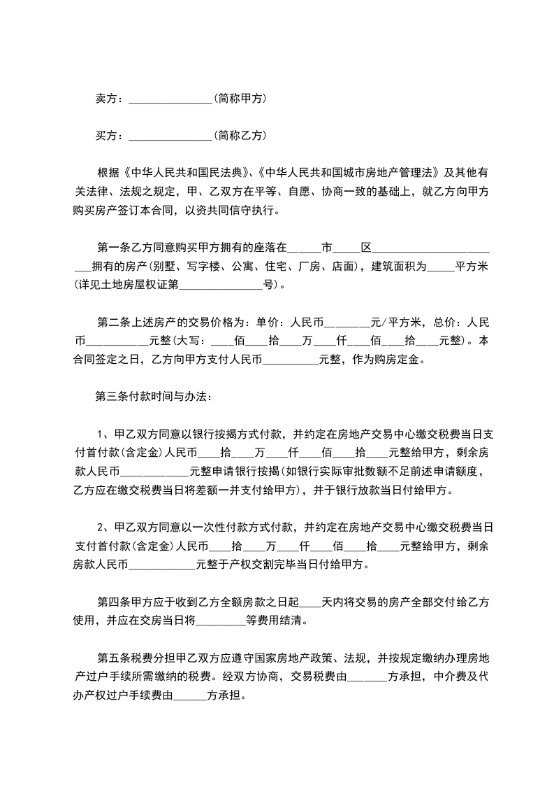 2、甲乙双方同意以一次性付款方式付款,并约定在房地产交易中心缴交税费当日支付首付款(含定金)人民币____拾____万____仟____佰____拾____元整给甲方,剩余房款人民币____________元整于产权交割完毕当日付给甲方。