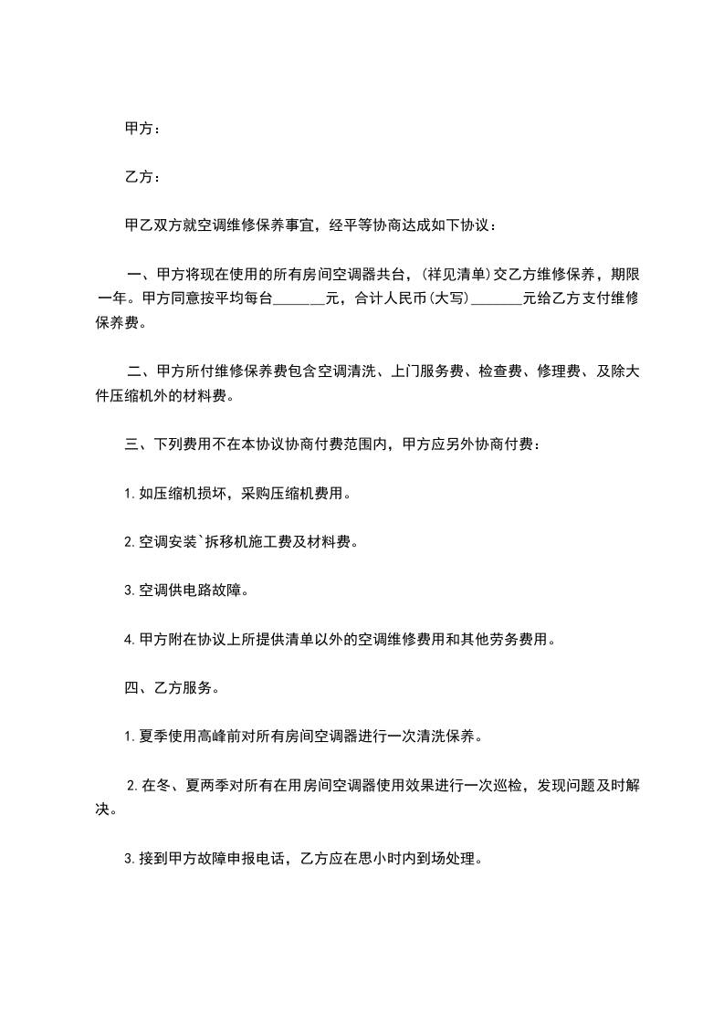 一、甲方将现在使用的所有房间空调器共台,(祥见清单)交乙方维修保养,期限一年。甲方同意按平均每台_______元,合计人民币(大写)_______元给乙方支付维修保养费。