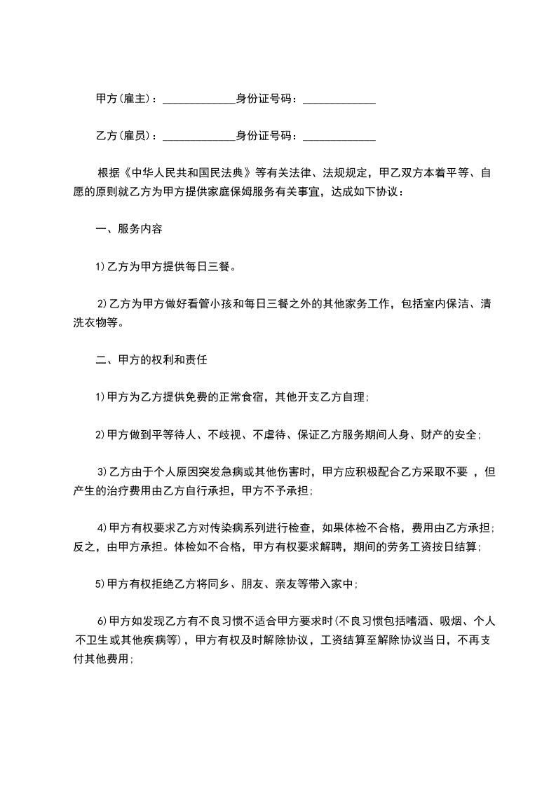 4.为保证甲方的家庭成员人身安全和财产安全,乙方的身份证自愿交由甲方保管,乙方工作期限满后,甲方应主动交还身份证。未经过甲方允许,乙方不能带外人到家中参观、住宿。
