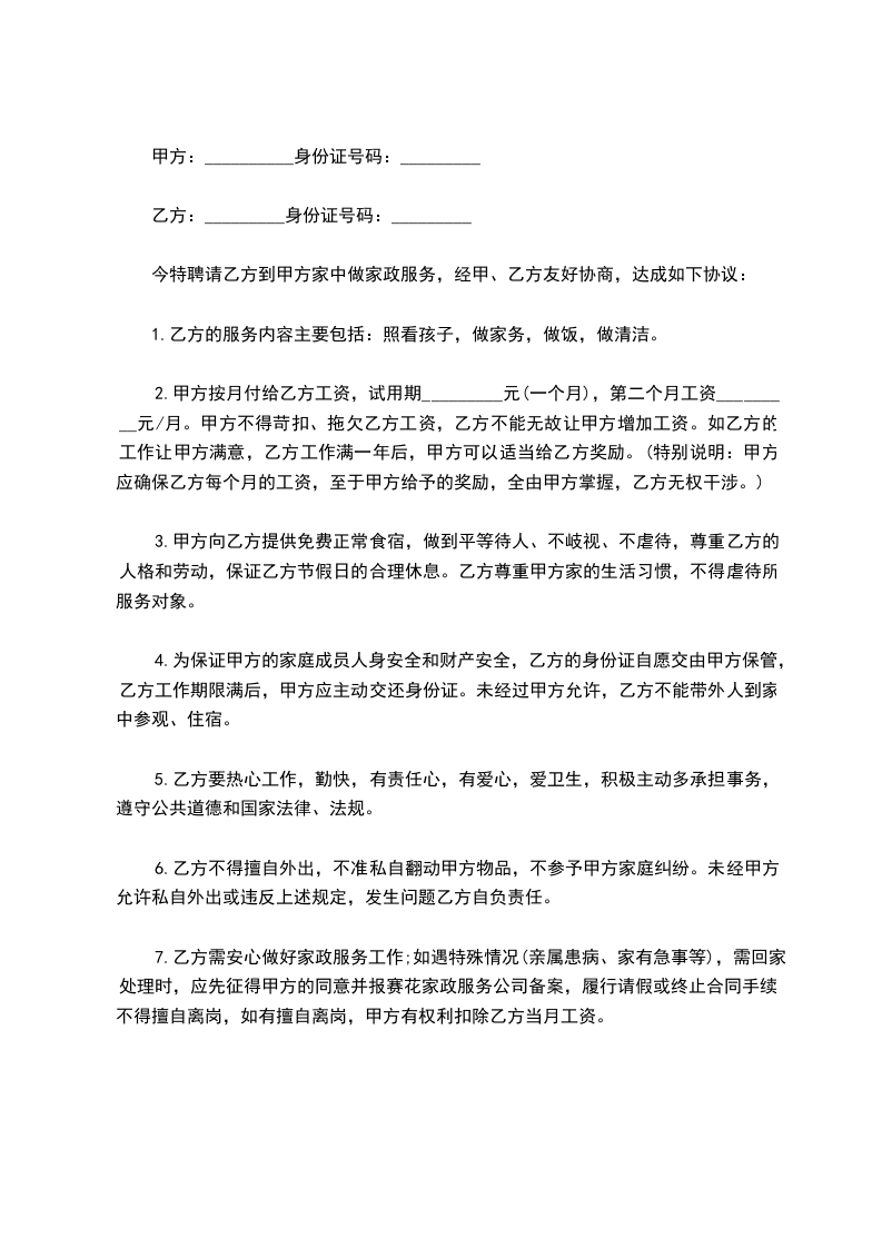 6.乙方不得擅自外出,不准私自翻动甲方物品,不参予甲方家庭纠纷。未经甲方允许私自外出或违反上述规定,发生问题乙方自负责任。