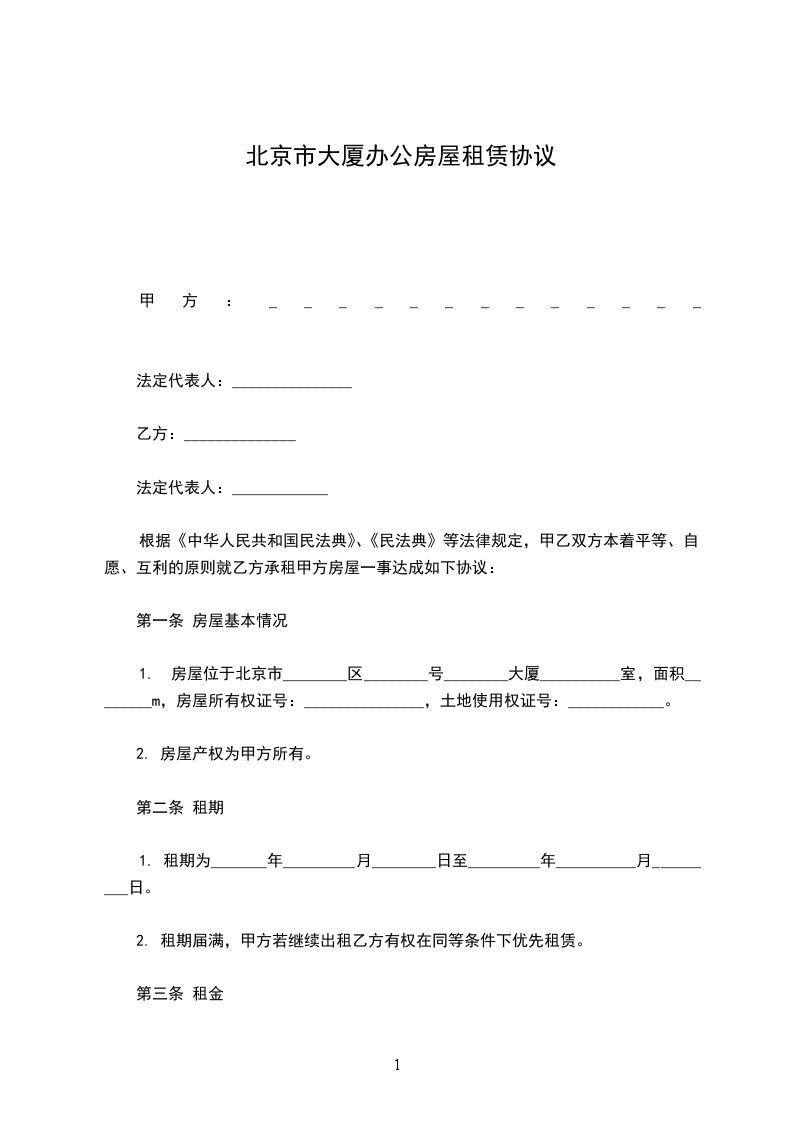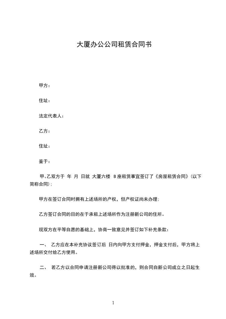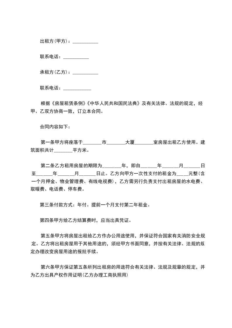 第一条甲方将座落于________市________大厦________室房屋出租乙方使用。建筑面积共计________平方米。