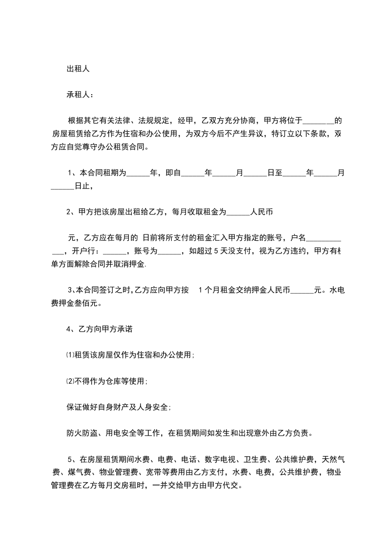 第二条乙方租用房屋的期限为________年,即自_______年_______月_______日至_______年_______月_______日止。乙方向甲方一次性支付的租金为_____元整(含一个月押金、物业管理费、有线电视费),乙方需另行负责支付出租房屋的水电费、取暖费、电话费、停车费。