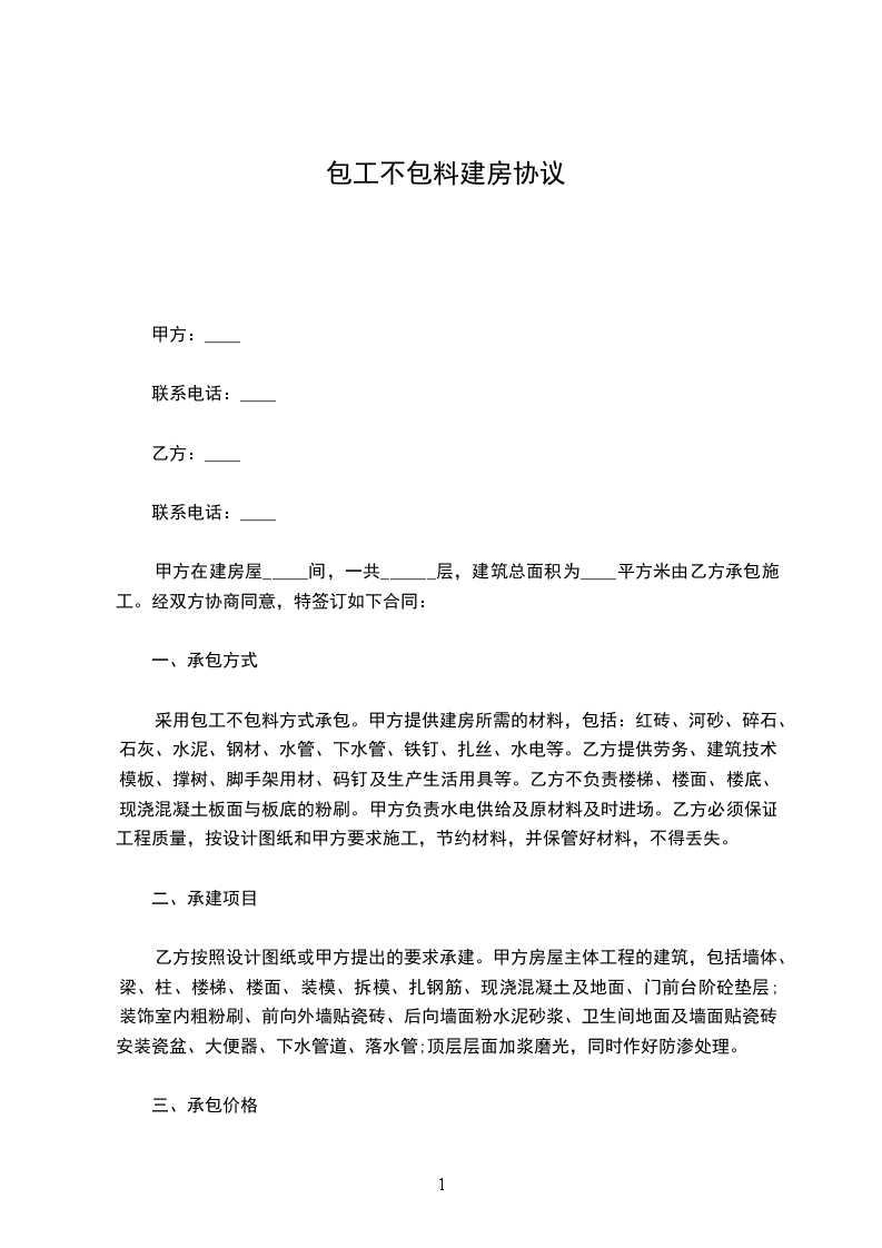 采用包工不包料方式承包。甲方提供建房所需的材料,包括:红砖、河砂、碎石、石灰、水泥、钢材、水管、下水管、铁钉、扎丝、水电等。乙方提供劳务、建筑技术、模板、撑树、脚手架用材、码钉及生产生活用具等。乙方不负责楼梯、楼面、楼底、现浇混凝土板面与板底的粉刷。甲方负责水电供给及原材料及时进场。乙方必须保证工程质量,按设计图纸和甲方要求施工,节约材料,并保管好材料,不得丢失。