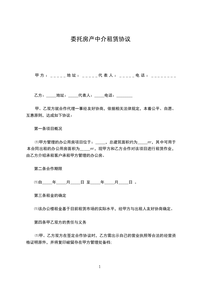 ⑴甲方管理的办公用房项目位于:_____,总建筑面积约为_____㎡,其中可用于本合同出租的办公用房面积为_____㎡,现甲方和乙方合作对该项目进行租赁作业,由乙方介绍承租客户承租甲方管理的办公房。