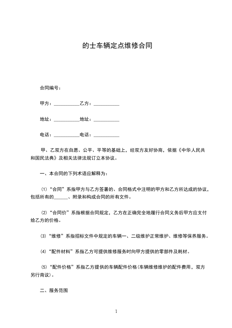 乙方负责甲方50台“的士”车辆的各级维护、维修(或根据甲方的要求提供车辆年检)和其他有关汽车维修的服务项目及交通事故车辆维修。