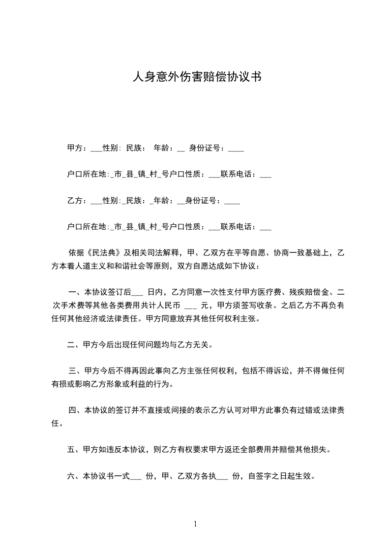 一、本协议签订后___ 日内,乙方同意一次性支付甲方医疗费、残疾赔偿金、二次手术费等其他各类费用共计人民币 ___ 元,甲方须签写收条。之后乙方不再负有任何其他经济或法律责任。甲方同意放弃其他任何权利主张。