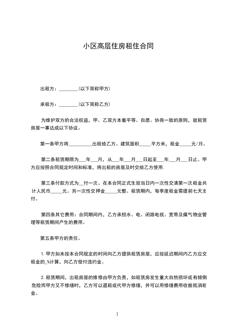 第一条甲方将__________出租给乙方。建筑面积_____平方米,租金_____元/月。