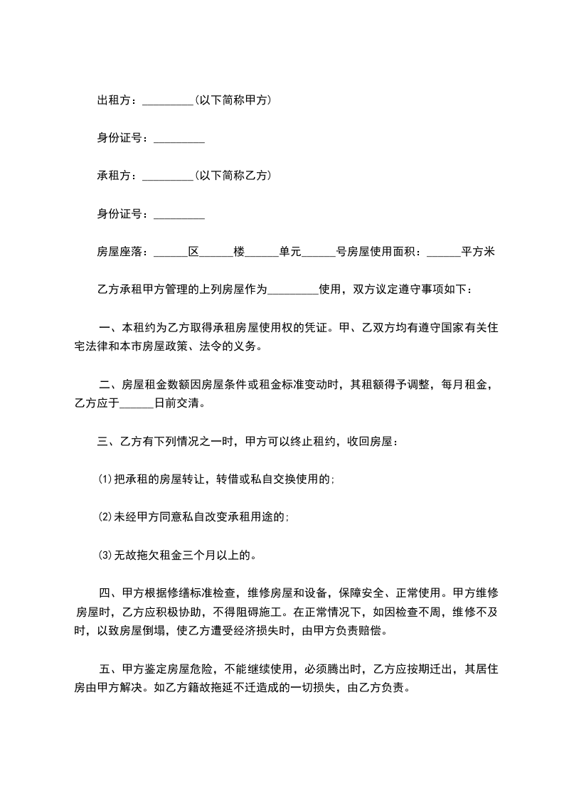 2、乙方租用上述房屋作(居住/商业)之用,未经甲方同意,乙方不得将房屋另作他用或转租;