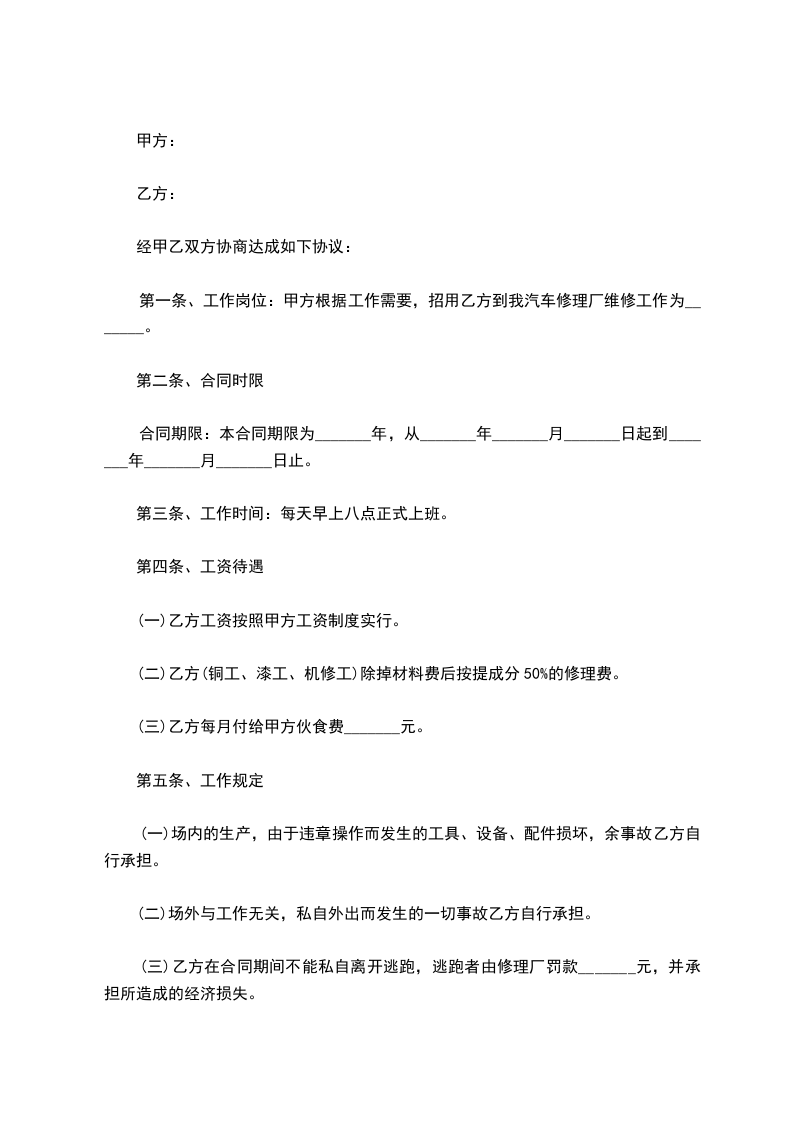 第一条、工作岗位:甲方根据工作需要,招用乙方到我汽车修理厂维修工作为_______。
