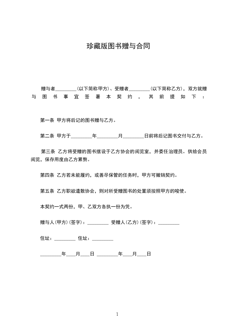 赠与者_________(以下简称甲方)、受赠者_________(以下简称乙方),双方就赠与________(图书事宜签订本契约,其条件如下: