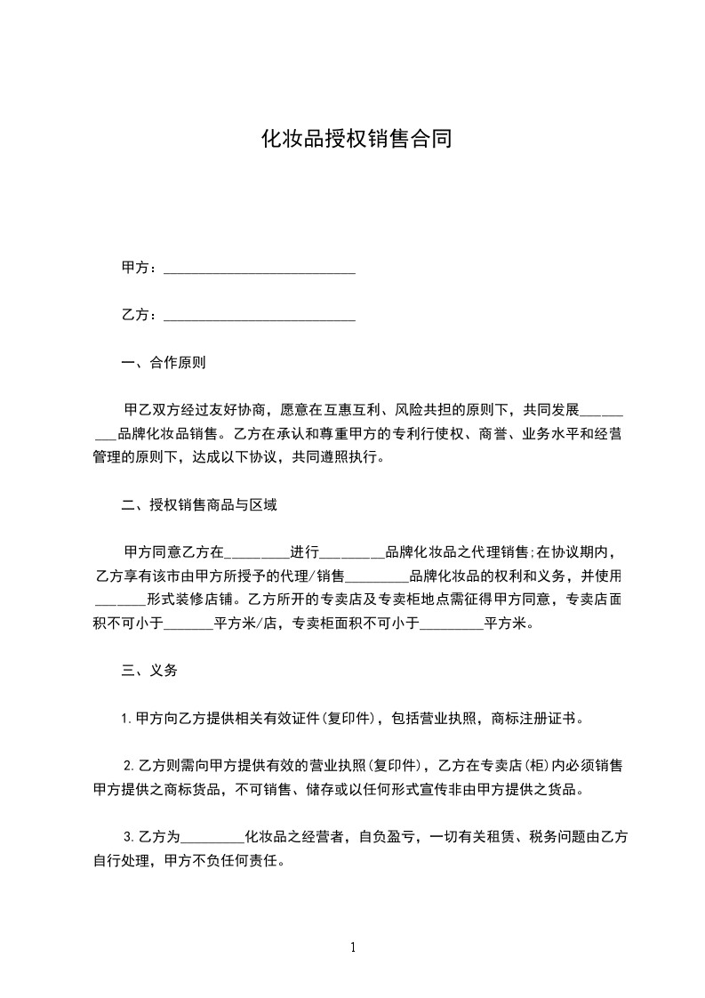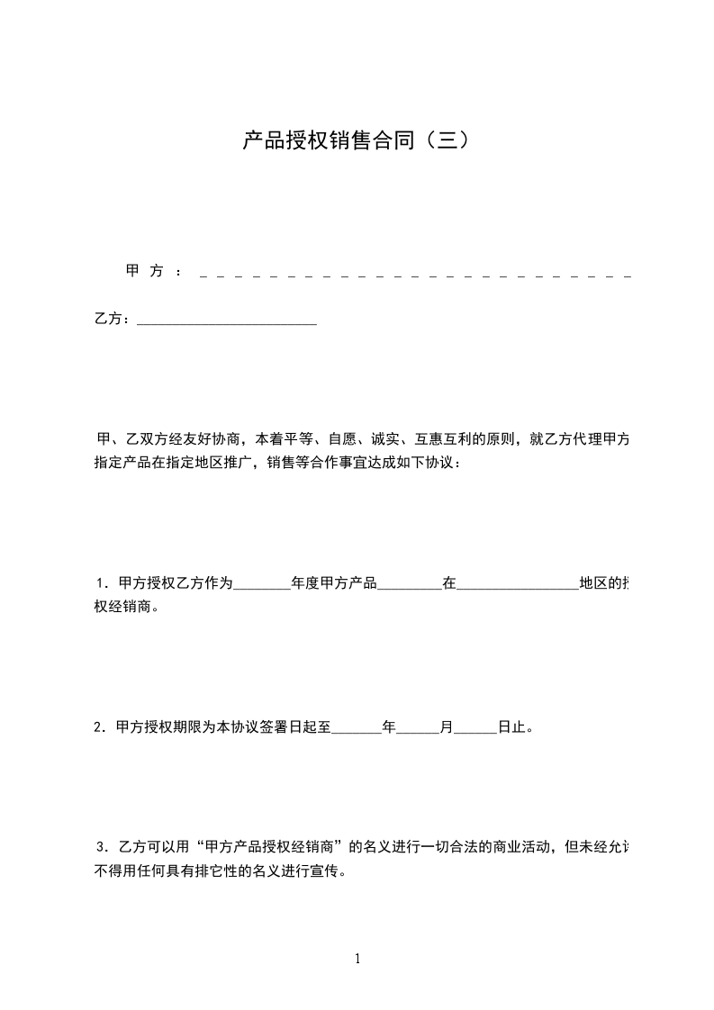 1.甲方授权乙方作为________年度甲方产品_________在_________________地区的授权经销商。