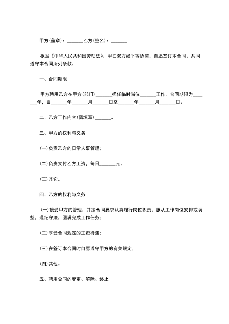 甲方聘用乙方在甲方(部门)_______担任临时岗位_______工作。合同期限为_______年,自_______年_______月_______日至_______年_______月_______日。