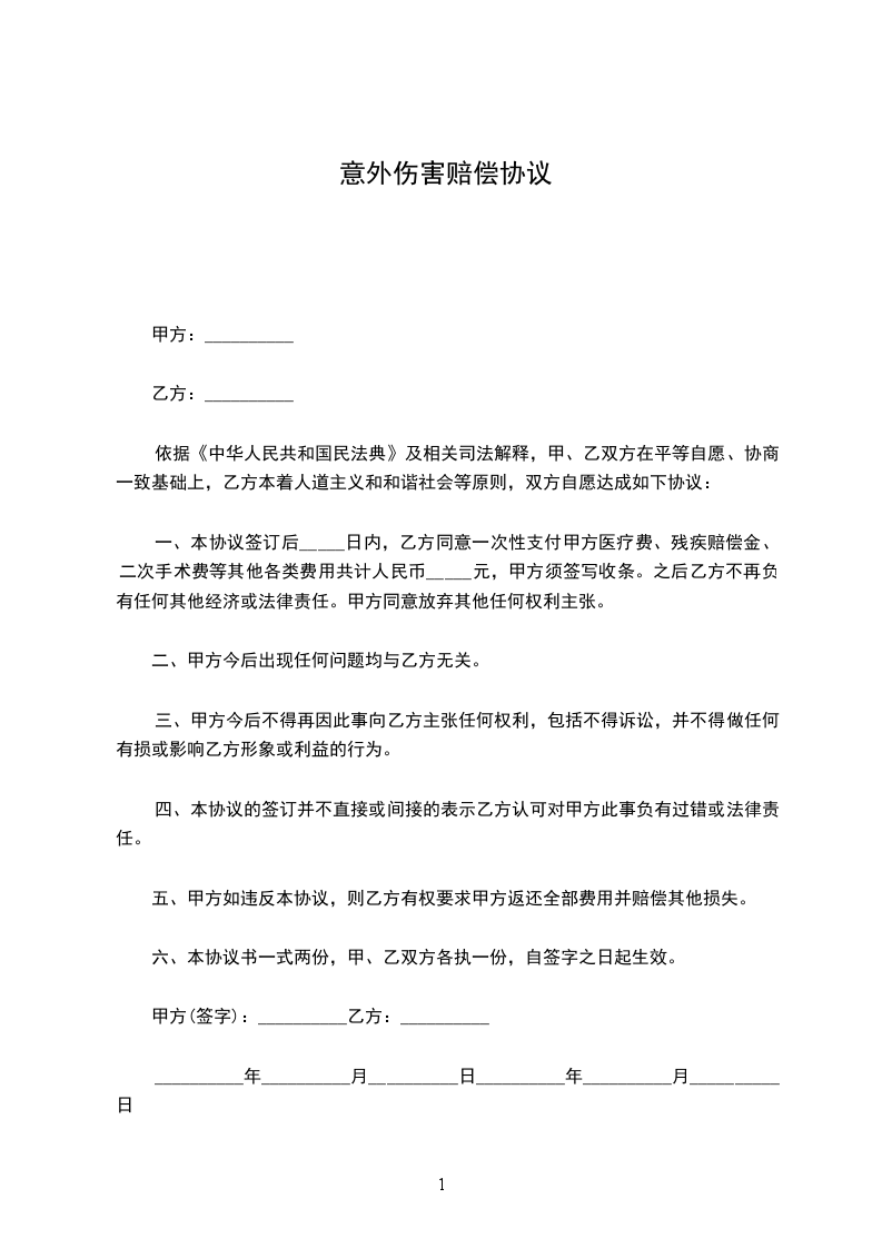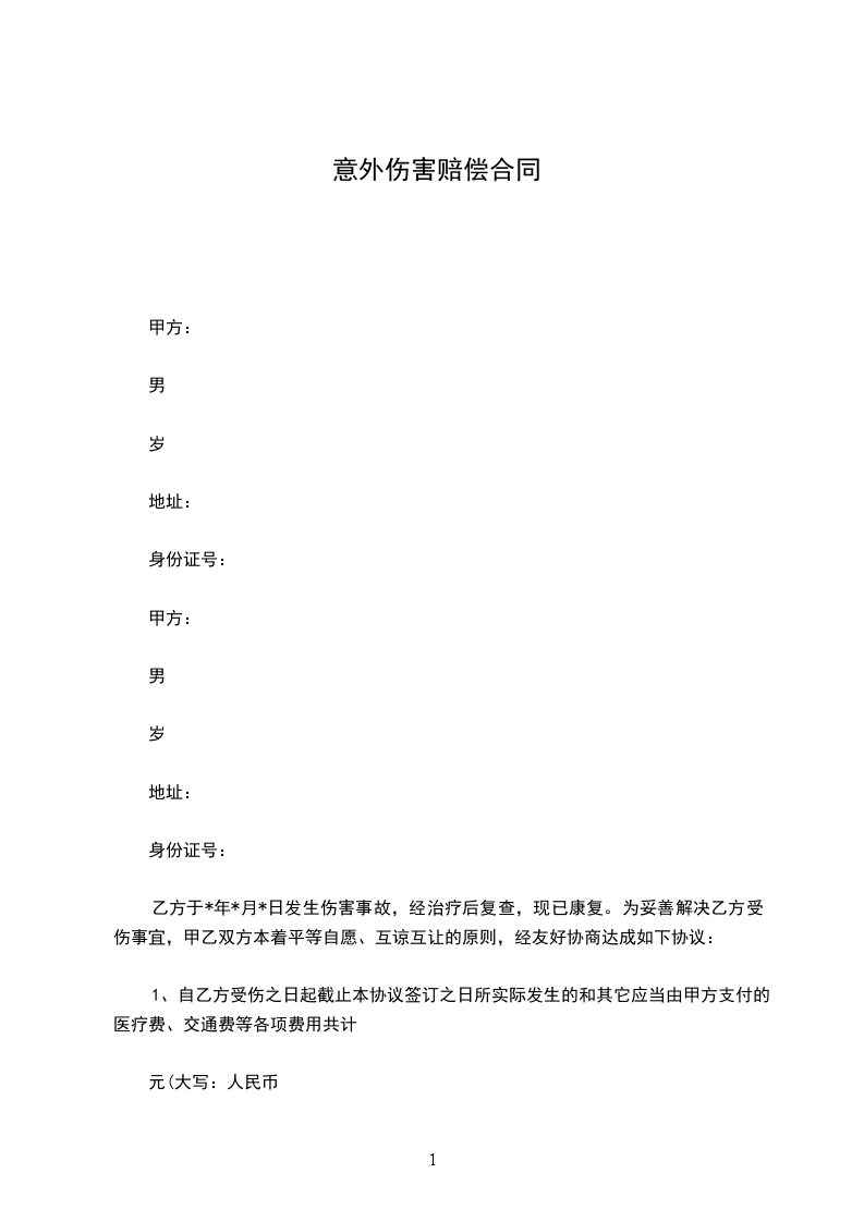 甲乙双方于________发生伤害事故,经治疗后复查,甲方现已康复,为妥善解决甲方受伤事宜,甲乙双方本着平等自愿、互谅互让的原则,经友好协商达成如下协议:
