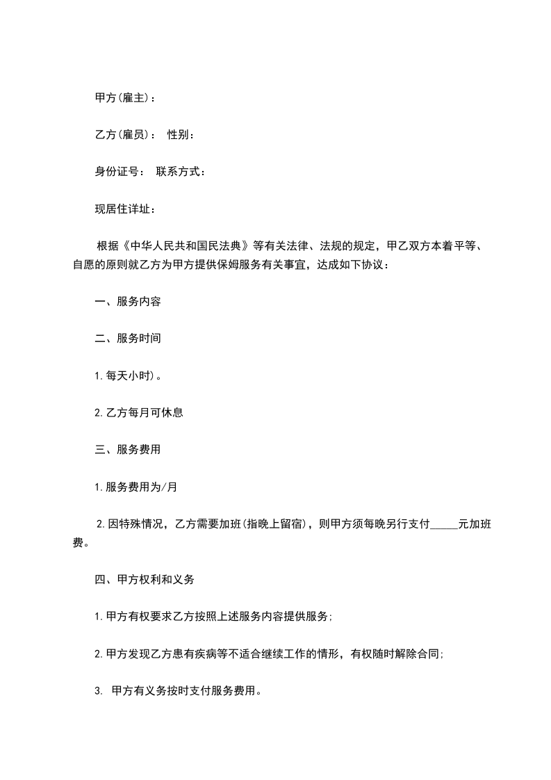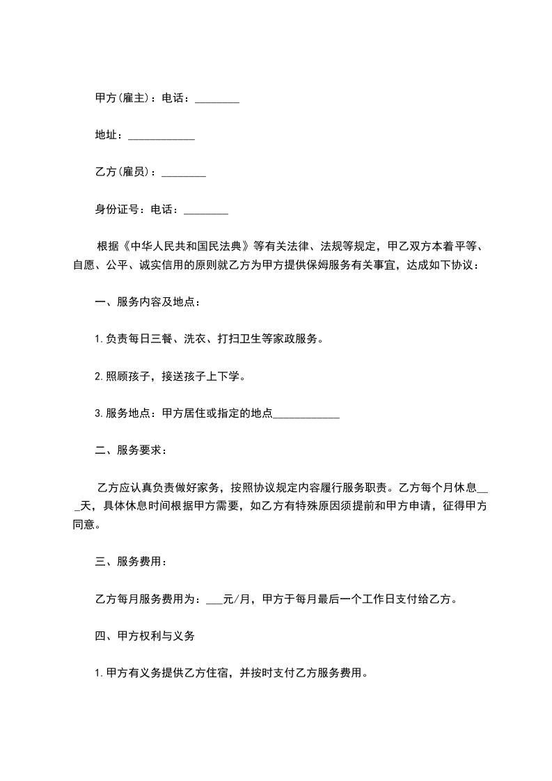 根据《中华人民共和国民法典》等有关法律、法规的规定,甲乙双方本着平等、自愿的原则就乙方为甲方提供保姆服务有关事宜,达成如下协议: