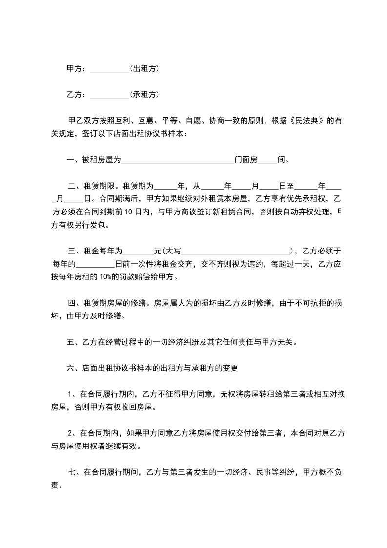 甲乙双方按照互利、互惠、平等、自愿、协商一致的原则,根据《民法典》的有关规定,签订以下店面出租协议书样本:
