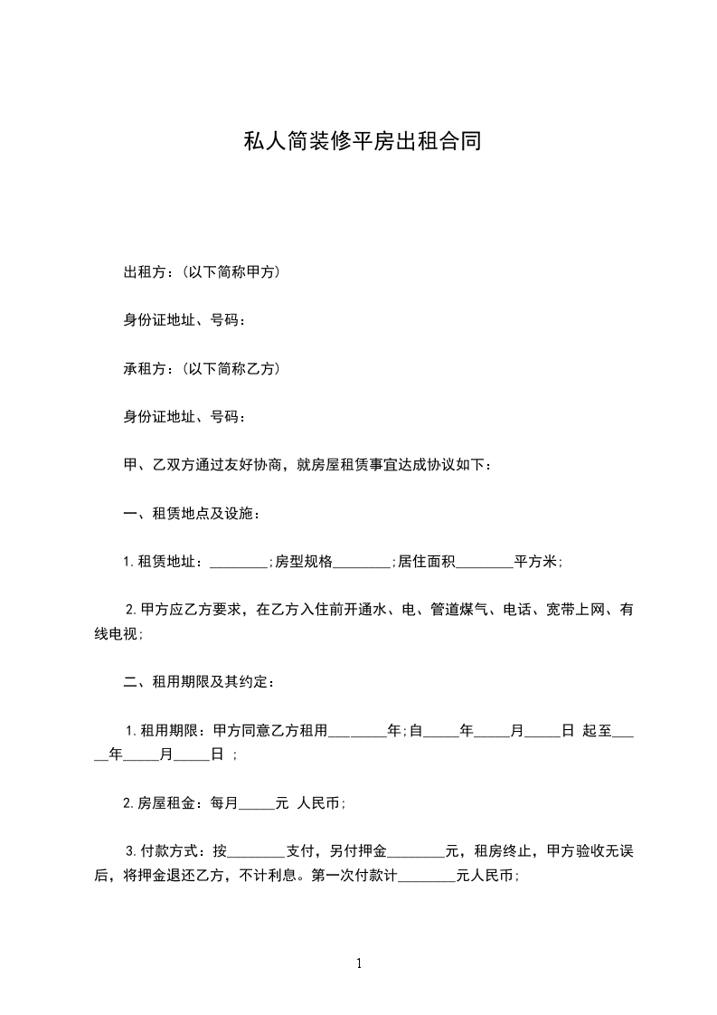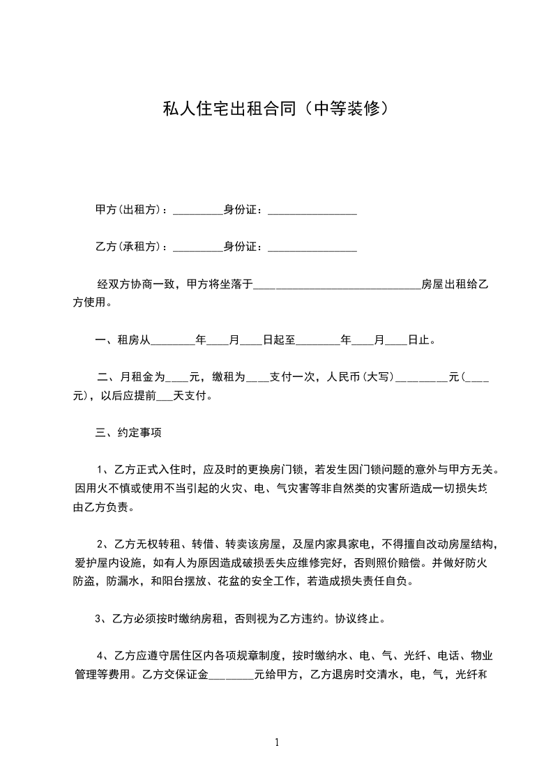 乙方交保证金________元给甲方,乙方退房时交清水,电,气,光纤和物业管理等费用及屋内设施家具、家电无损坏,下水管道,厕所无堵漏。甲方如数退还保证金。