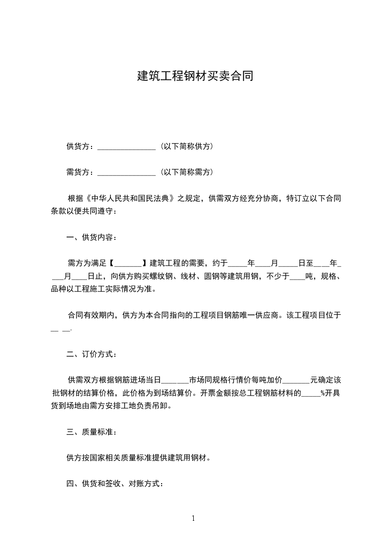 需方为满足【_______】建筑工程的需要,约于_____年____月_____日至____年____月____日止,向供方购买螺纹钢、线材、圆钢等建筑用钢,不少于____吨,规格、品种以工程施工实际情况为准。