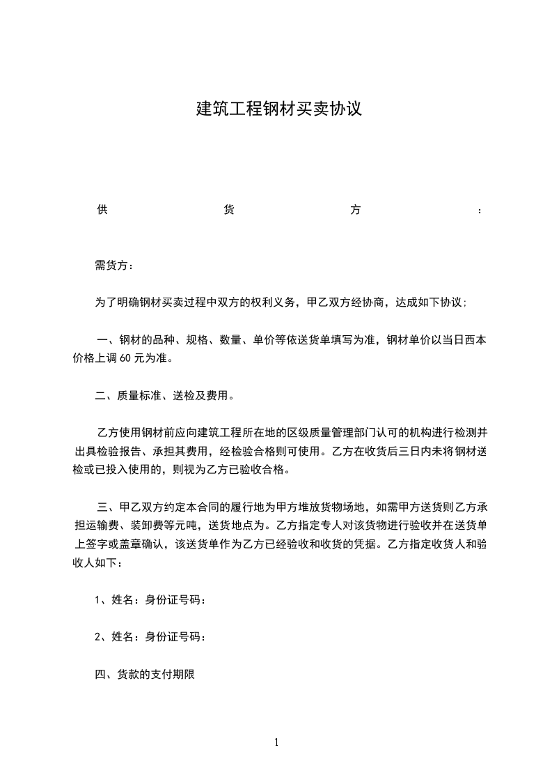 需方指定(身份证号码:_________,电话:________)为需方货物接收人,负责供方所有到场钢材交接工作。钢材进场前,需方需将指定的货物接收人的身份证复印件和货物接收人签名样本交于供方。