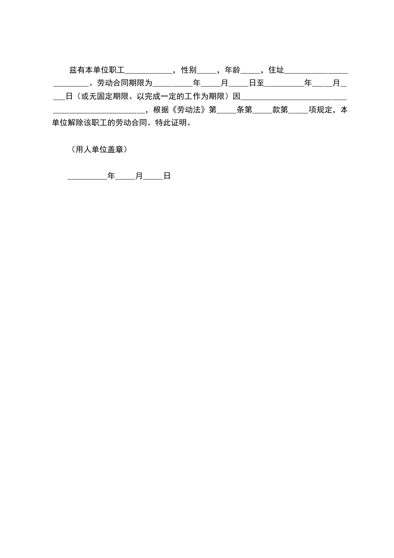 兹有本单位职工____________,性别_____,年龄_____,住址_________________________。劳动合同期限为__________年_____月_____日至__________年_____月_____日(或无固定期限、以完成一定的工作为期限)因__________________________________________________,根据《劳动法》第_____条第_____款第_____项规定,本单位解除该职工的劳动合同。特此证明。
