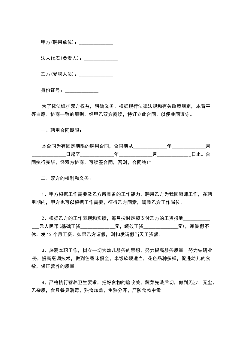 1、甲方根据工作需要及乙方所具备的工作能力,聘用乙方为我园厨师工作,在聘用期内,甲方也可以根据工作需要,征得乙方同意,调整乙方工作岗位。