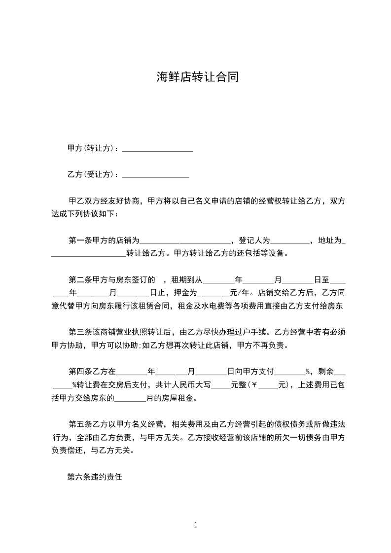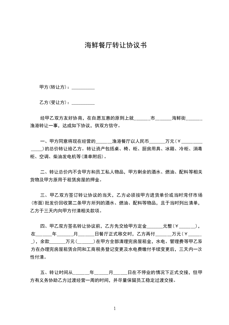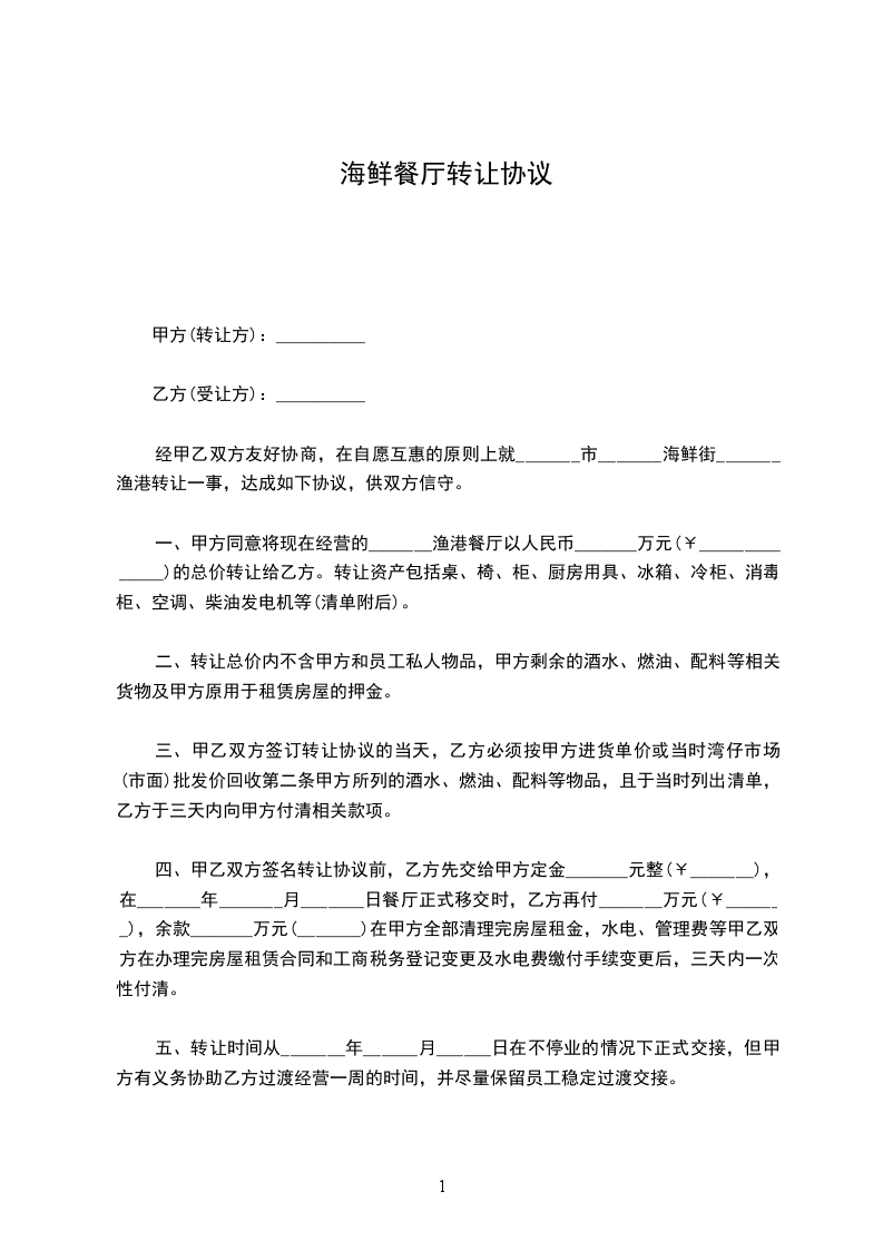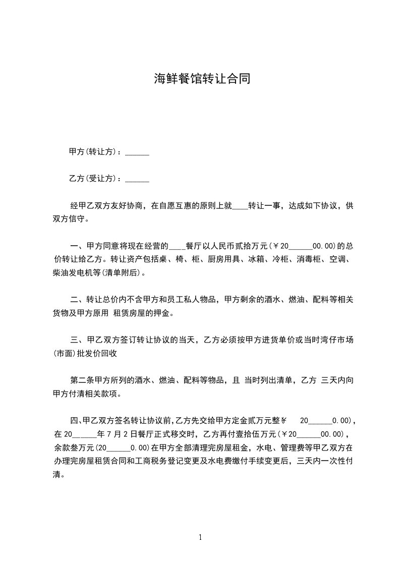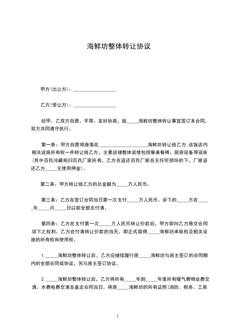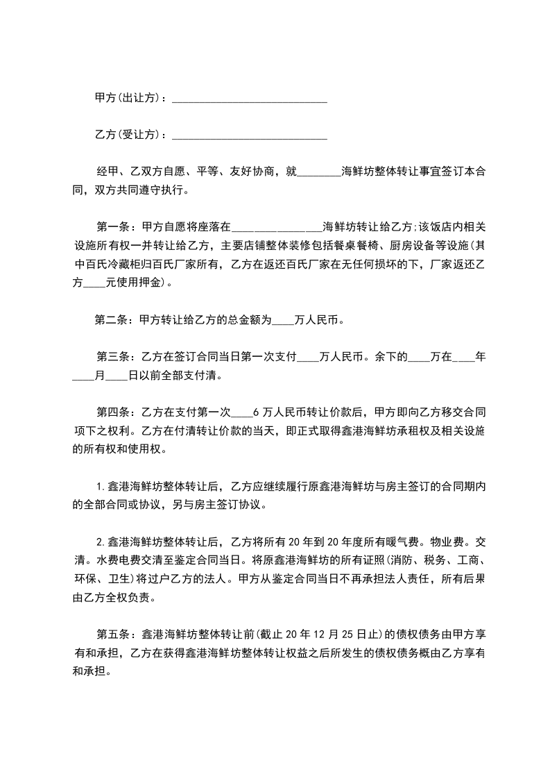 经甲、乙双方自愿、平等、友好协商,就________海鲜坊整体转让事宜签订本合同,双方共同遵守执行。