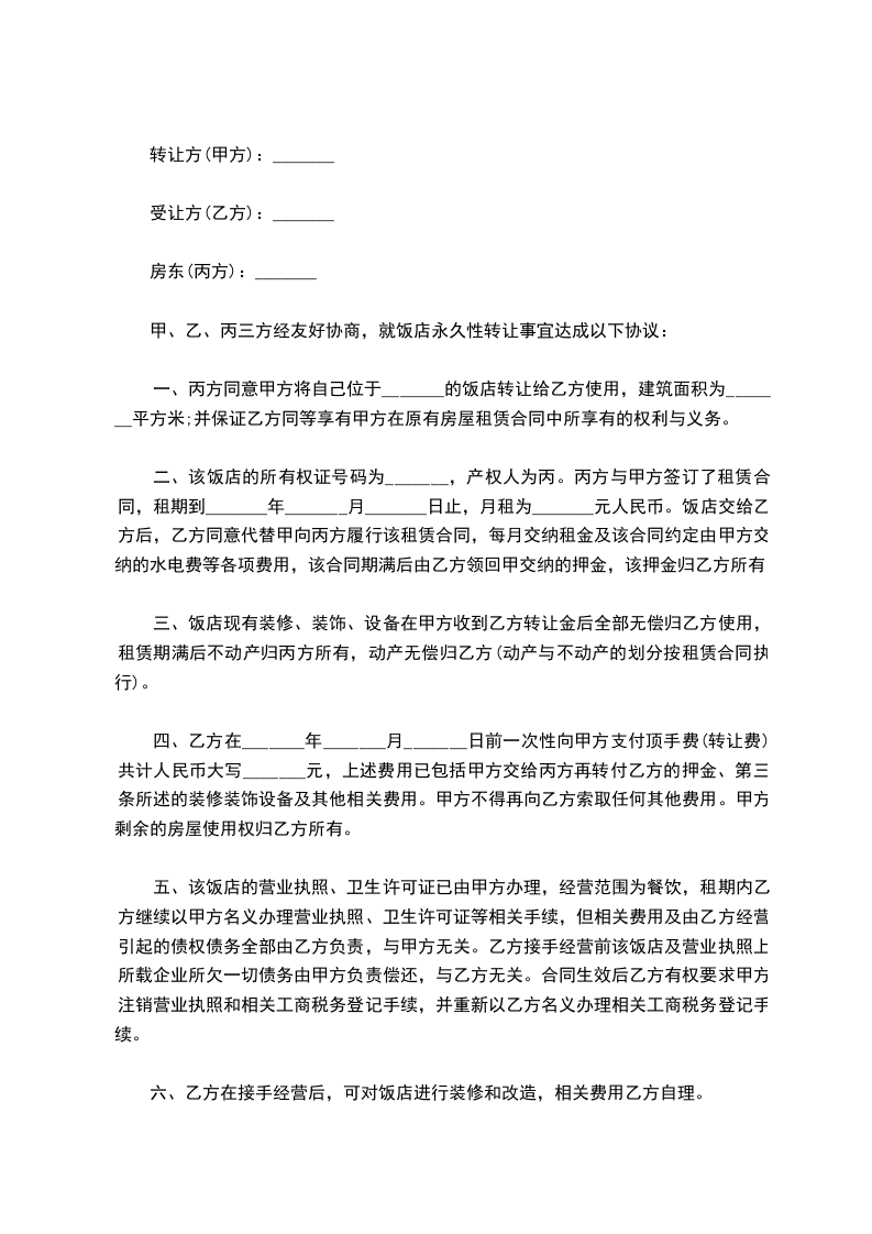 第一条:甲方自愿将座落在________________海鲜坊转让给乙方;该饭店内相关设施所有权一并转让给乙方,主要店铺整体装修包括餐桌餐椅、厨房设备等设施(其中百氏冷藏柜归百氏厂家所有,乙方在返还百氏厂家在无任何损坏的下,厂家返还乙方____元使用押金)。
