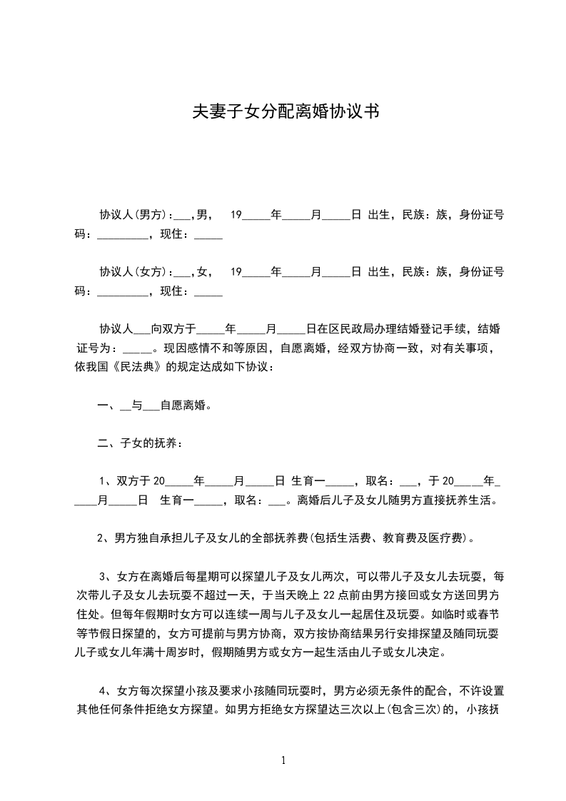 协议人(女方):___,女,19_____年_____月_____日 出生,民族:族,身份证号码:_________,现住:_____