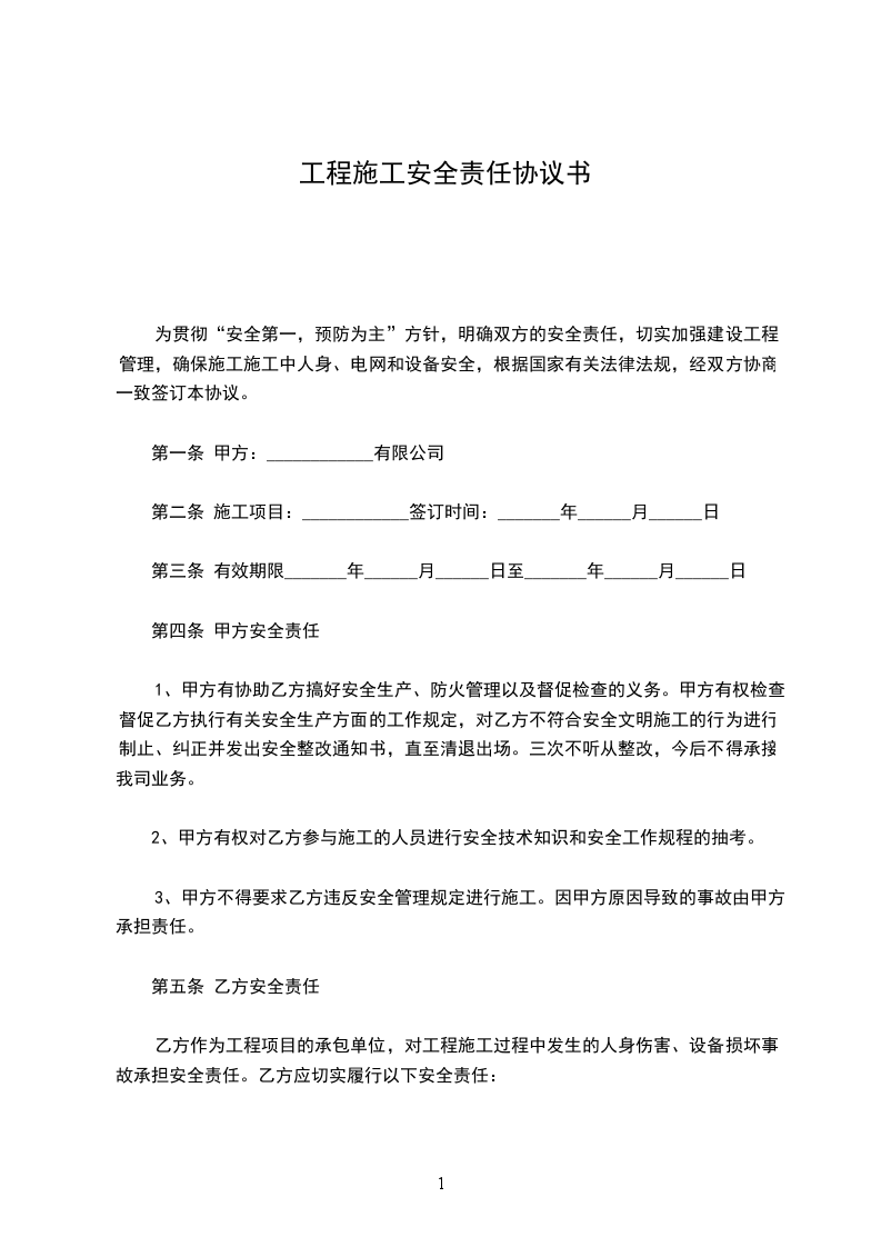 为贯彻“安全第一,预防为主”方针,明确双方的安全责任,切实加强建设工程管理,确保施工施工中人身、电网和设备安全,根据国家有关法律法规,经双方协商一致签订本协议。