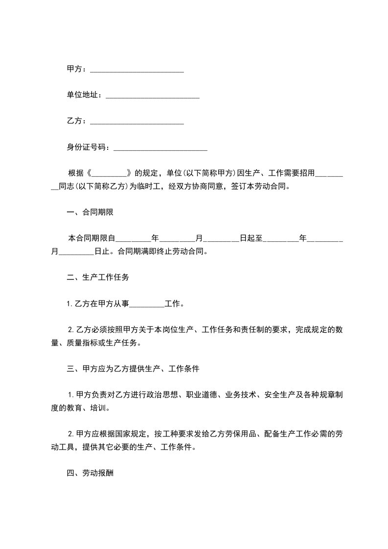 根据《_________》的规定,单位(以下简称甲方)因生产、工作需要招用_________同志(以下简称乙方)为临时工,经双方协商同意,签订本劳动合同。