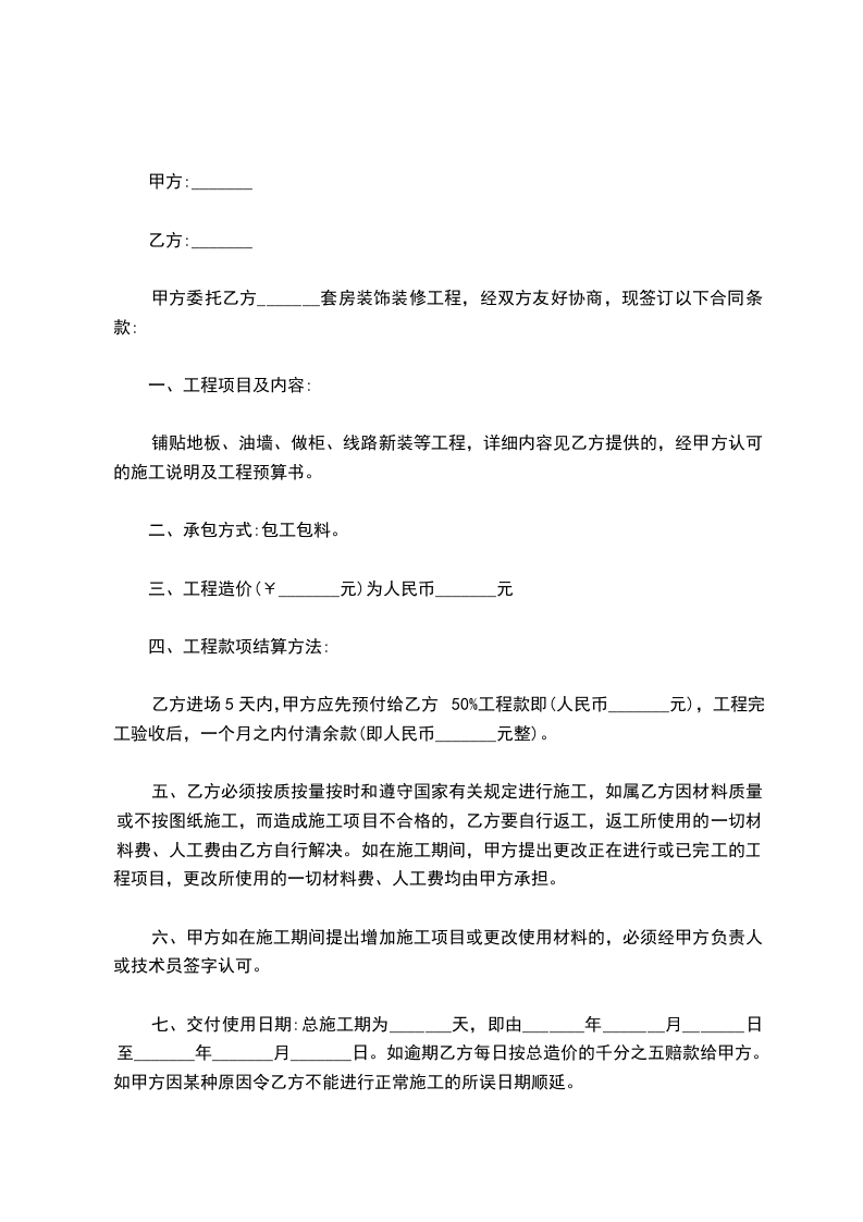(2)乙方包工、部分包料,甲方提供部分材料(详见《甲方提供装饰装修材料明细表》、《乙方提供装饰装修材料明细表》);