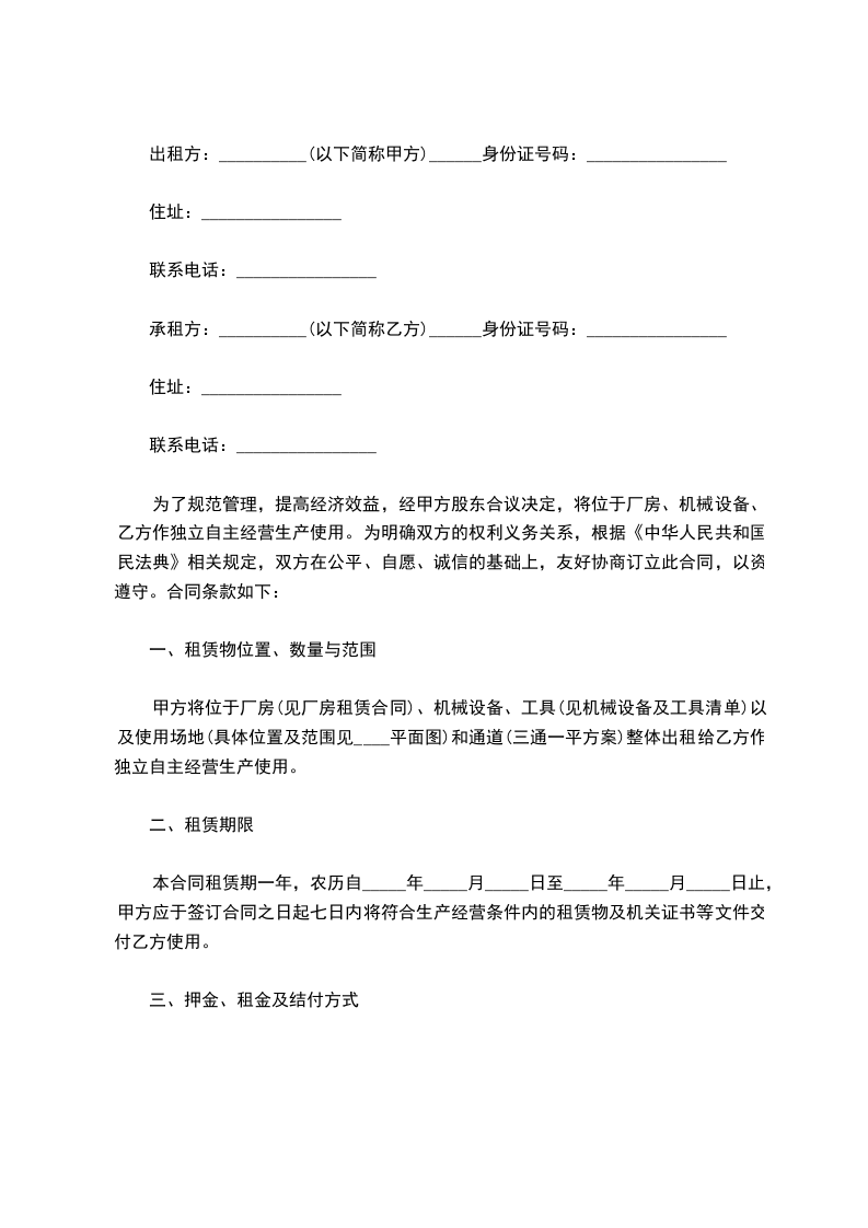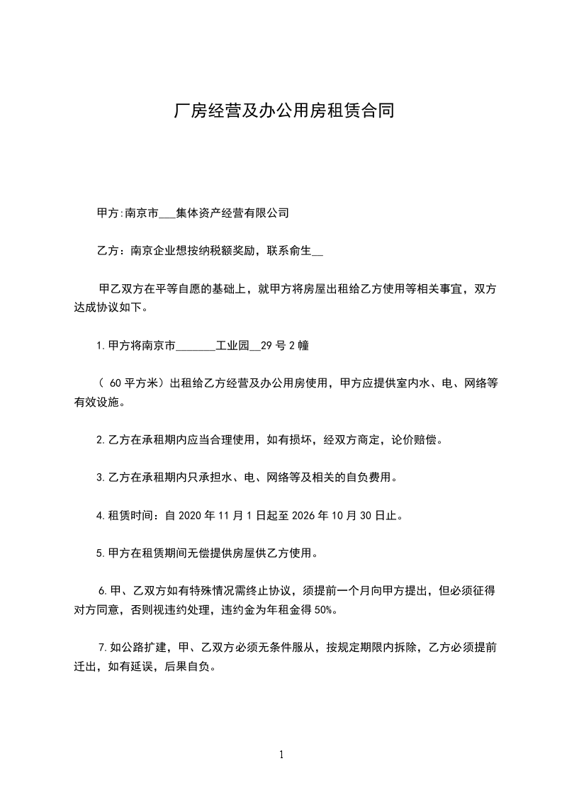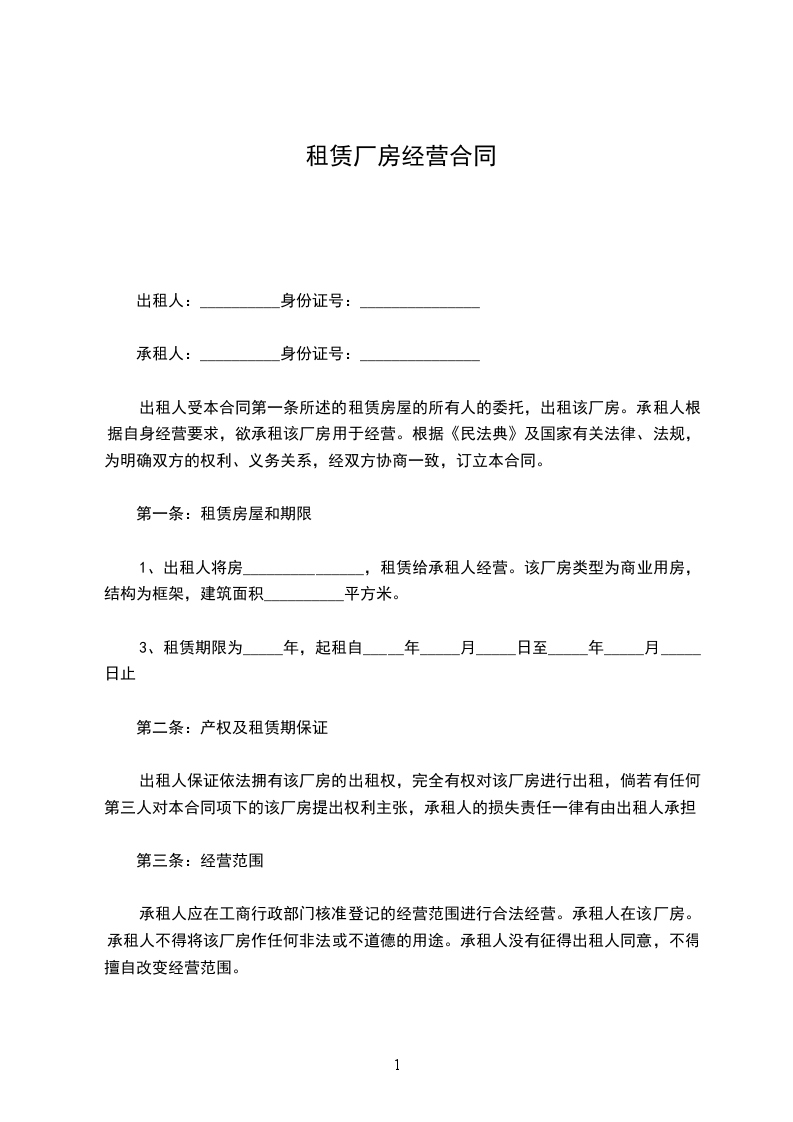 1、出租人将房_______________,租赁给承租人经营。该厂房类型为商业用房,结构为框架,建筑面积__________平方米。