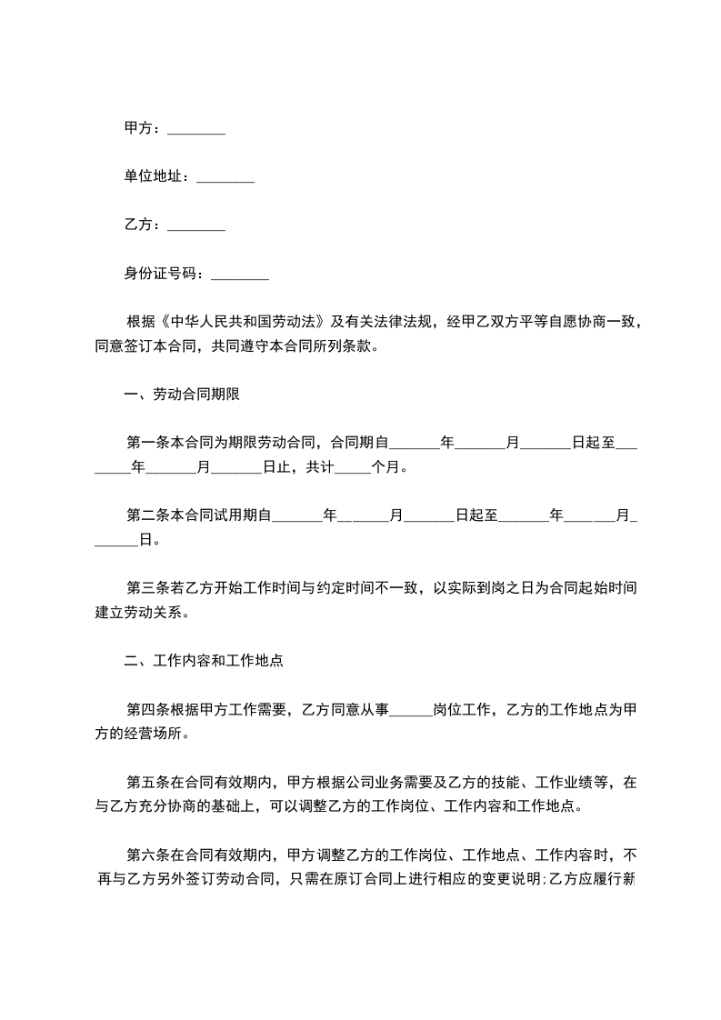 第一条本合同为期限劳动合同,合同期自_______年_______月_______日起至________年_______月_______日止,共计_____个月。