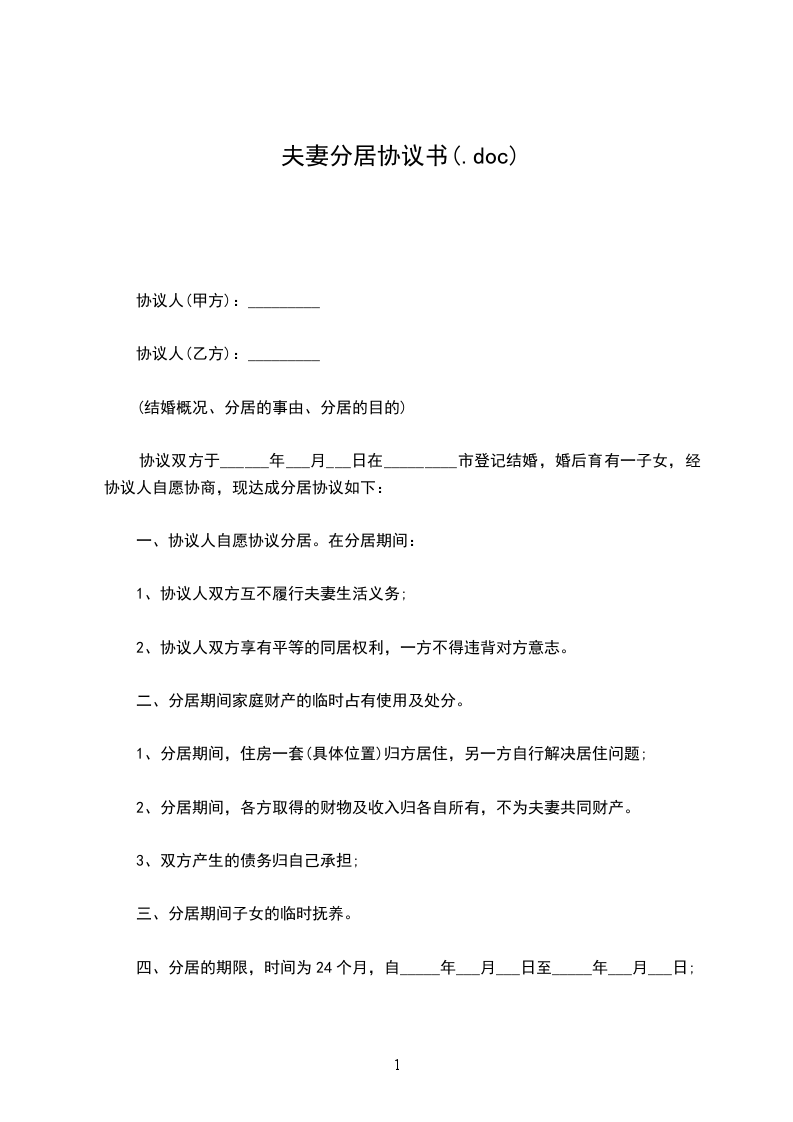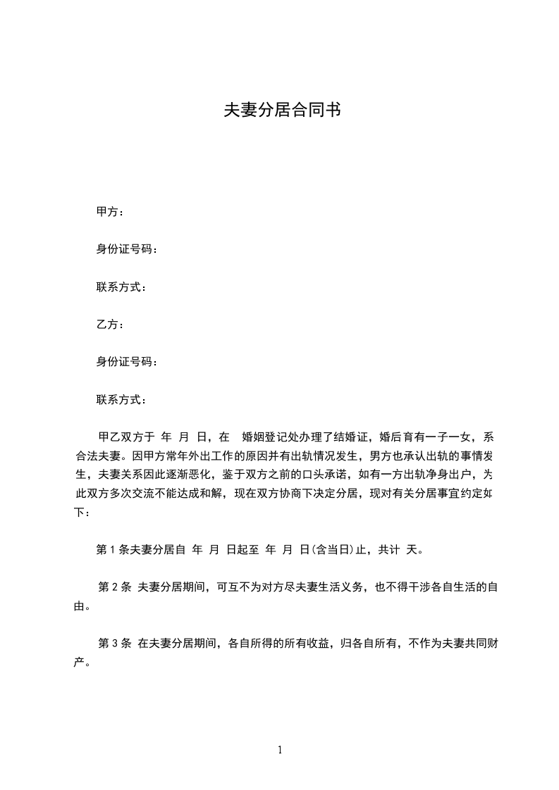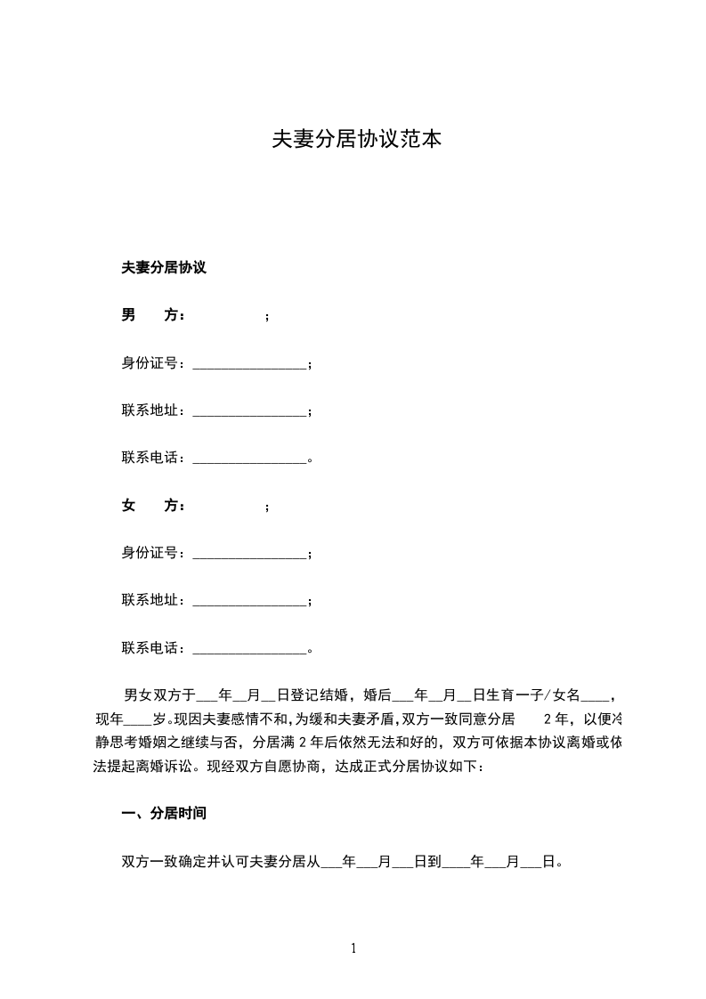 男女双方于 年 月 日登记结婚,婚后 年 月 日生育一子/女名 ,现年 岁。现因夫妻感情不和,为缓和夫妻矛盾,双方一致同意分居 2年,以便冷静思考婚姻之继续与否,分居满2年后依然无法和好的,双方可依据本协议离婚或依法提起离婚诉讼。现经双方自愿协商,达成正式分居协议如下: