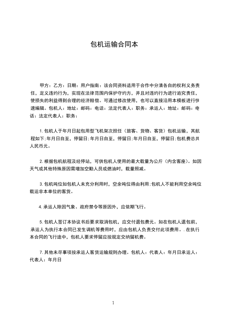 1.包机人于___________年_______月_______日起包用型飞机架次担任(旅客、货物、客货)包机运输,其航程如下;