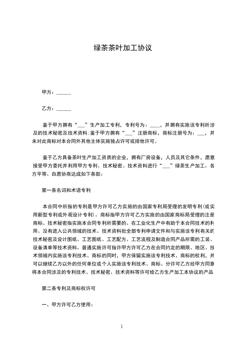 鉴于乙方具备茶叶生产加工资质的企业,拥有厂房设备,人员及其它条件,愿意接受甲方委托并利用甲方专利、技术秘密、技术资料进行“___”绿茶生产加工。各方平等、自愿协商达成如下条款: