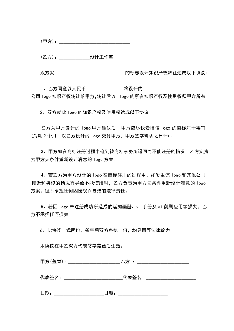 乙方同意以人民币______________,将设计的___________________________公司LOGO知识产权转让给甲方,转让后该LOGO的所有知识产权及使用权归甲方所有。