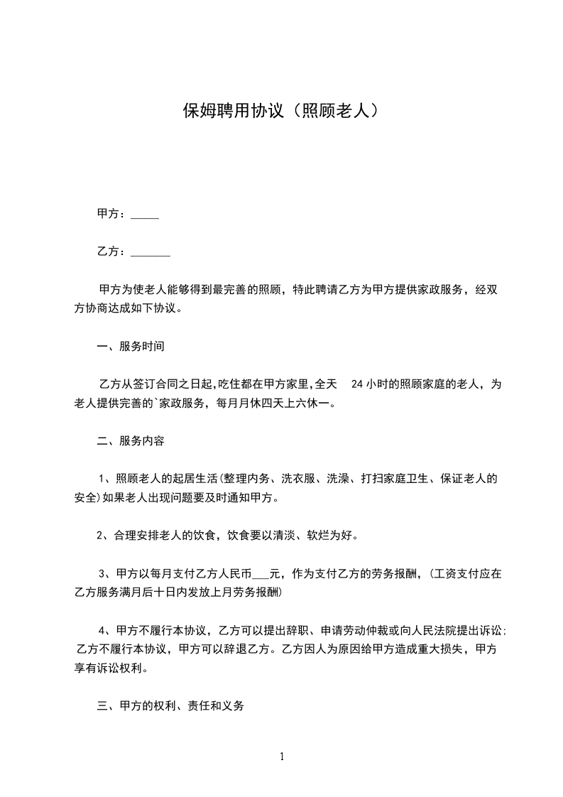 甲方家中老人年事已高,需要家政服务人员提供相关家政服务;乙方自称今年____岁、身体健康,能够照顾甲方老人的生活起居等家政服务各项工作的能力。甲乙双方根据平等自愿的原则,经协商就涉及家庭服务过程中的相关权利与义务达成协议,具体内容如下:
