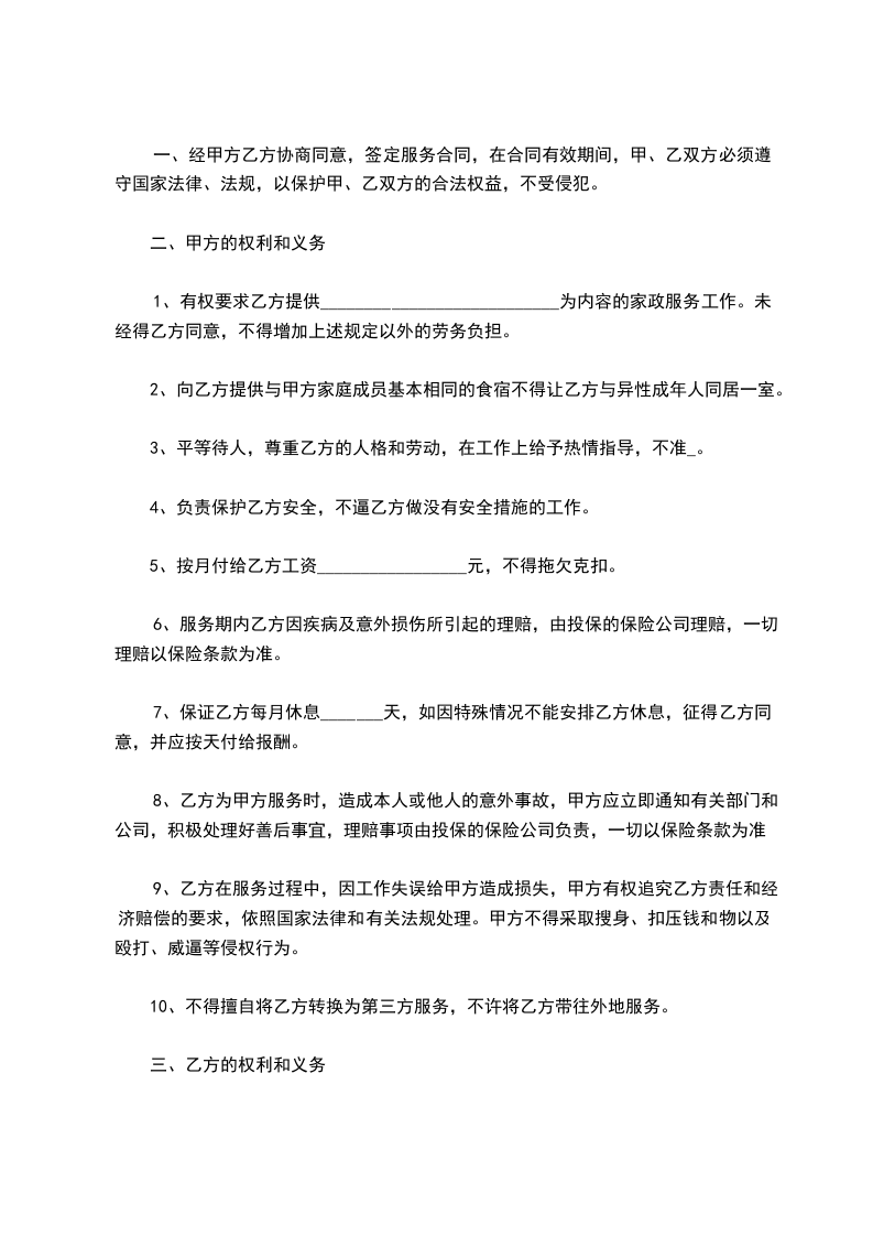 2.甲方在家时可主动减轻乙方的劳务,如做饭、打扫卫生、洗衣服等。