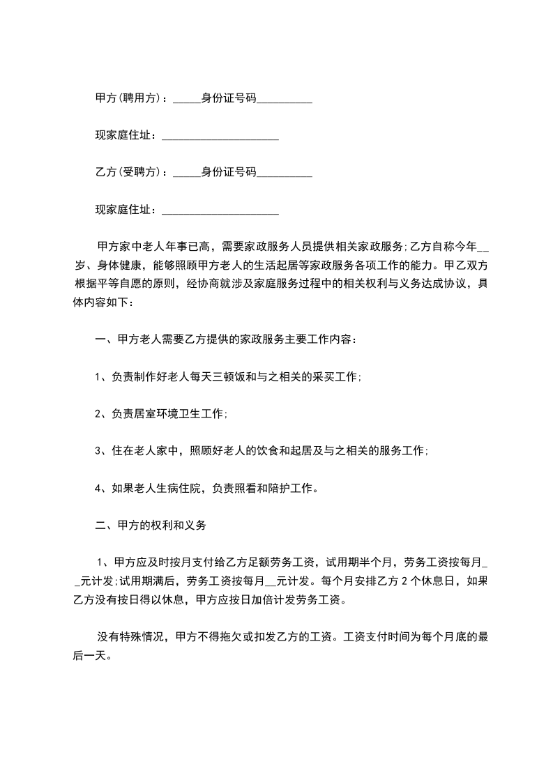 甲方为使老人能够得到最完善的照顾,特此聘请乙方为甲方提供家政服务,经双方协商达成如下协议。