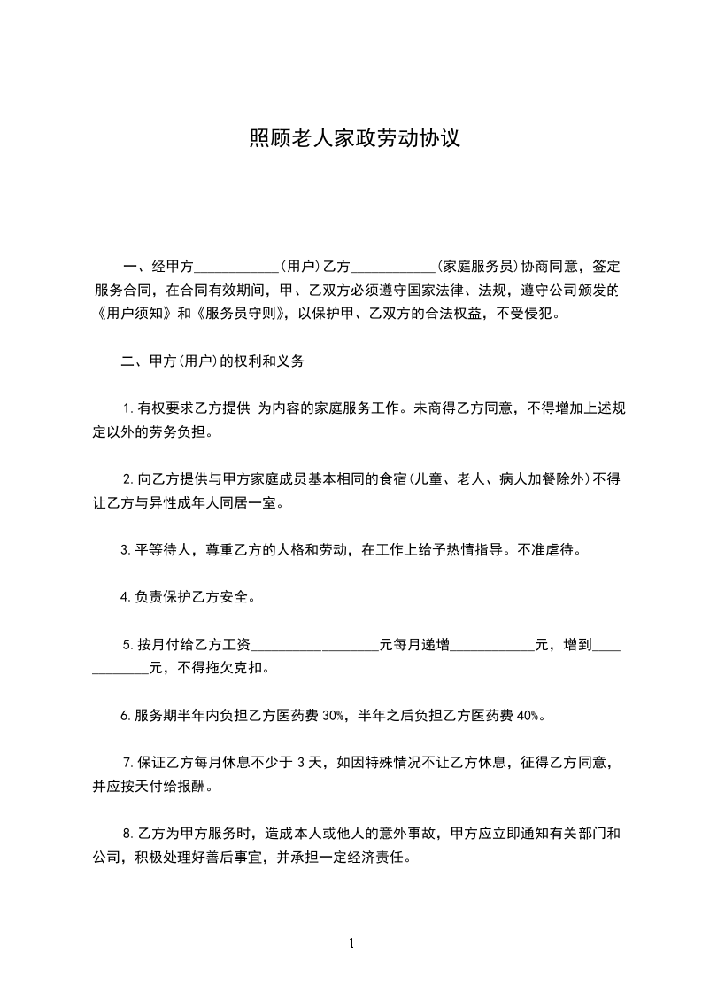 8、乙方不得参与甲方家庭及邻纠纷,不得对外泄露甲方家庭信息等隐私,尊重甲方老人的生活习惯,不得虐待所服务对象。