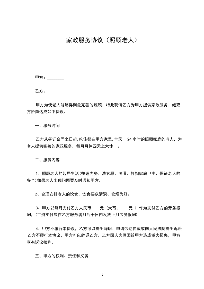 甲方家中老人年事已高,需要家政服务人员提供相关家政服务;乙方自称今年____岁、身体健康,能够照顾甲方老人的生活起居等家政服务各项工作的能力。甲乙双方根据平等自愿的原则,经协商就涉及家庭服务过程中的相关权利与义务达成协议,具体内容如下: