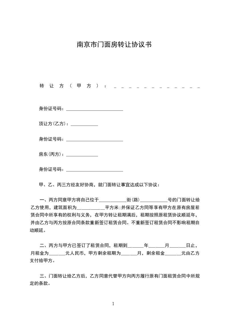 一、丙方同意甲方将自己位于____________街(路)____________号的门面转让给乙方使用,建筑面积为____________平方米;并保证乙方同等享有甲方在原有房屋租赁合同中所享有的权利与义务,在甲方转让租期满后,租期按照原租赁协议顺延年,并由乙方与丙方按原合同条款重新签订租赁合同。不重新签订租赁合同不影响租期自动顺延。