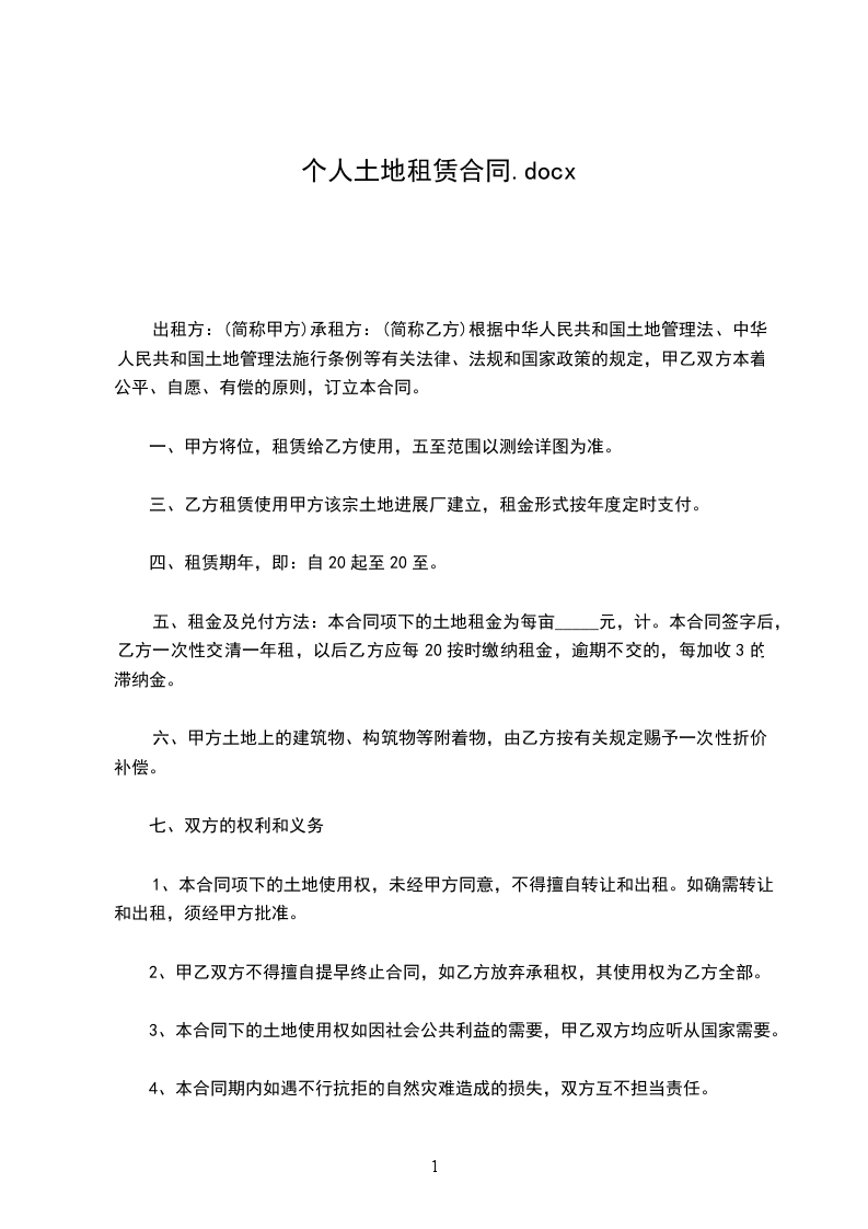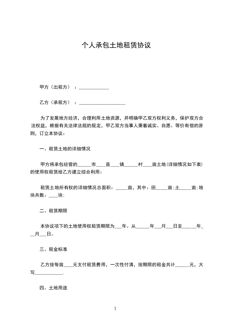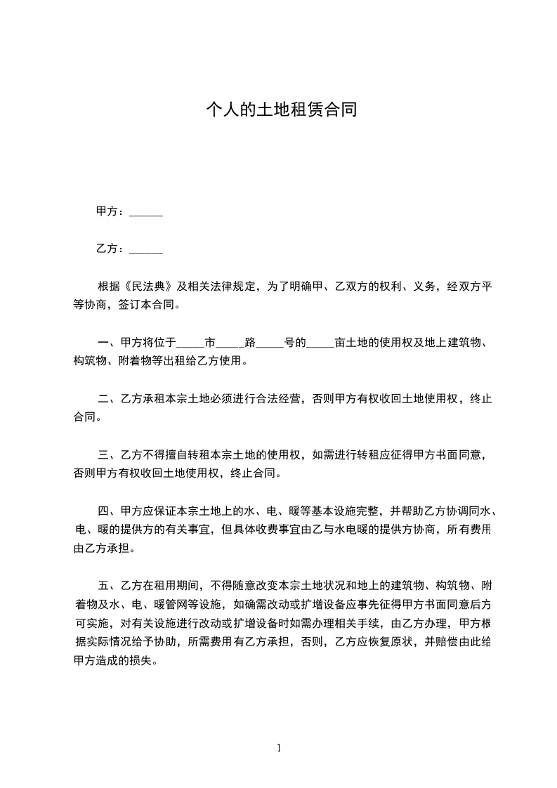一、甲方将位于_____市_____路_____号的_____亩土地的使用权及地上建筑物、构筑物、附着物等出租给乙方使用。