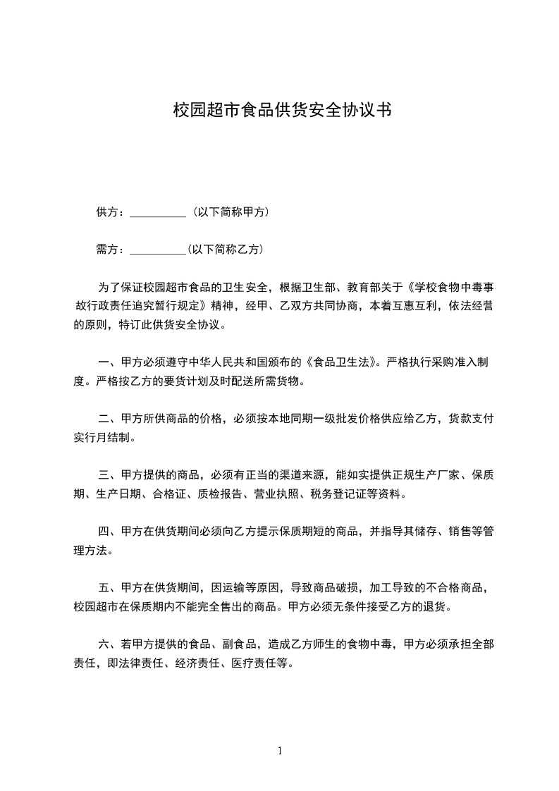 4、乙方有义务向甲方提供甲方所需要的有关食品资料:食品生产厂家的营业执照复印件、卫生许可证复印件以及食品检测报告等。