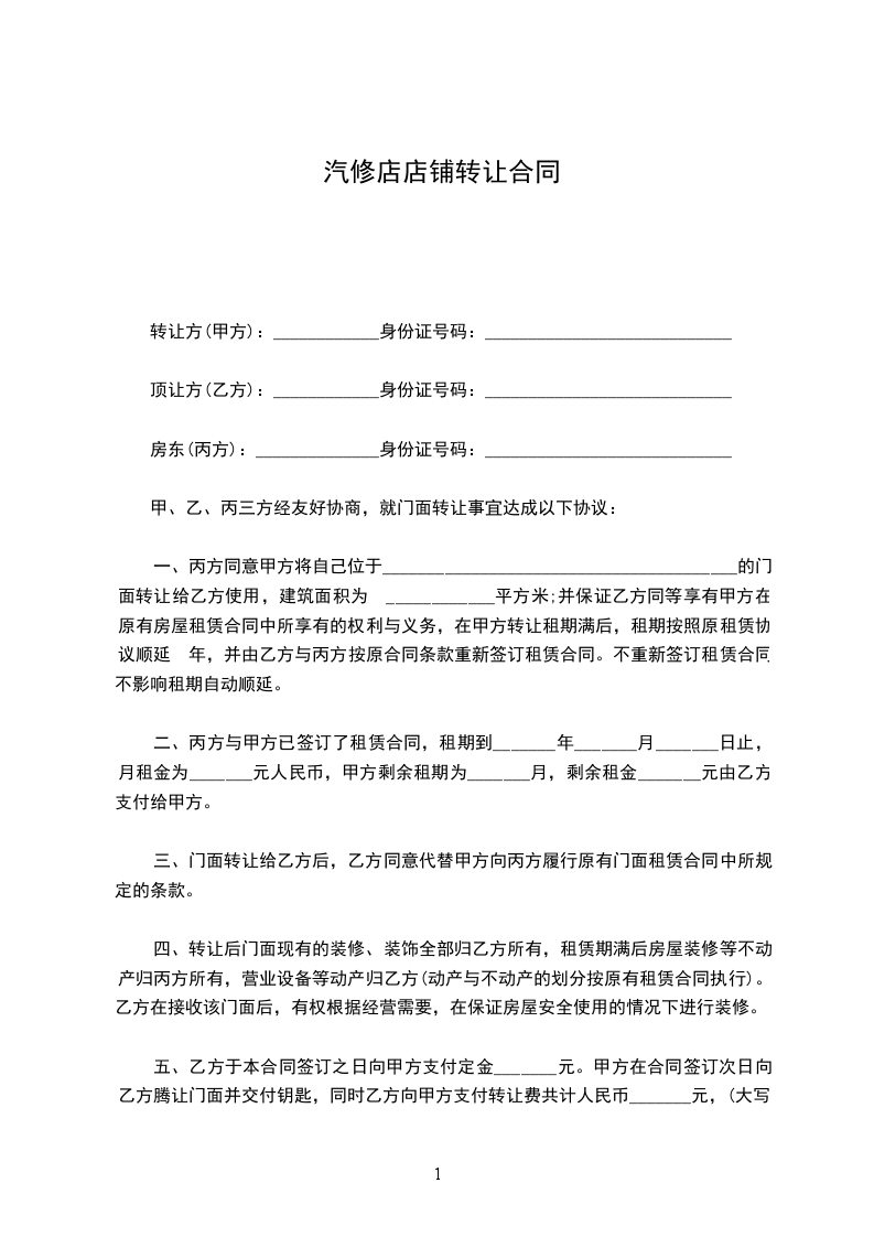 一、丙方同意甲方将自己位于________________________________________的门面转让给乙方使用,建筑面积为 ____________平方米;并保证乙方同等享有甲方在原有房屋租赁合同中所享有的权利与义务,在甲方转让租期满后,租期按照原租赁协议顺延 年,并由乙方与丙方按原合同条款重新签订租赁合同。不重新签订租赁合同不影响租期自动顺延。