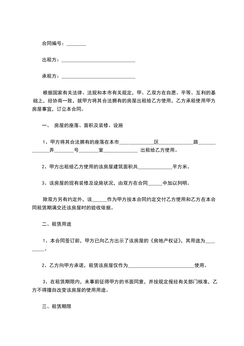 根据国家有关法律、法规和本市有关规定,甲、乙双方在自愿、平等、互利的基础上,经协商一致,就甲方将其合法拥有的房屋出租给乙方使用,乙方承租使用甲方房屋事宜,订立本合同。