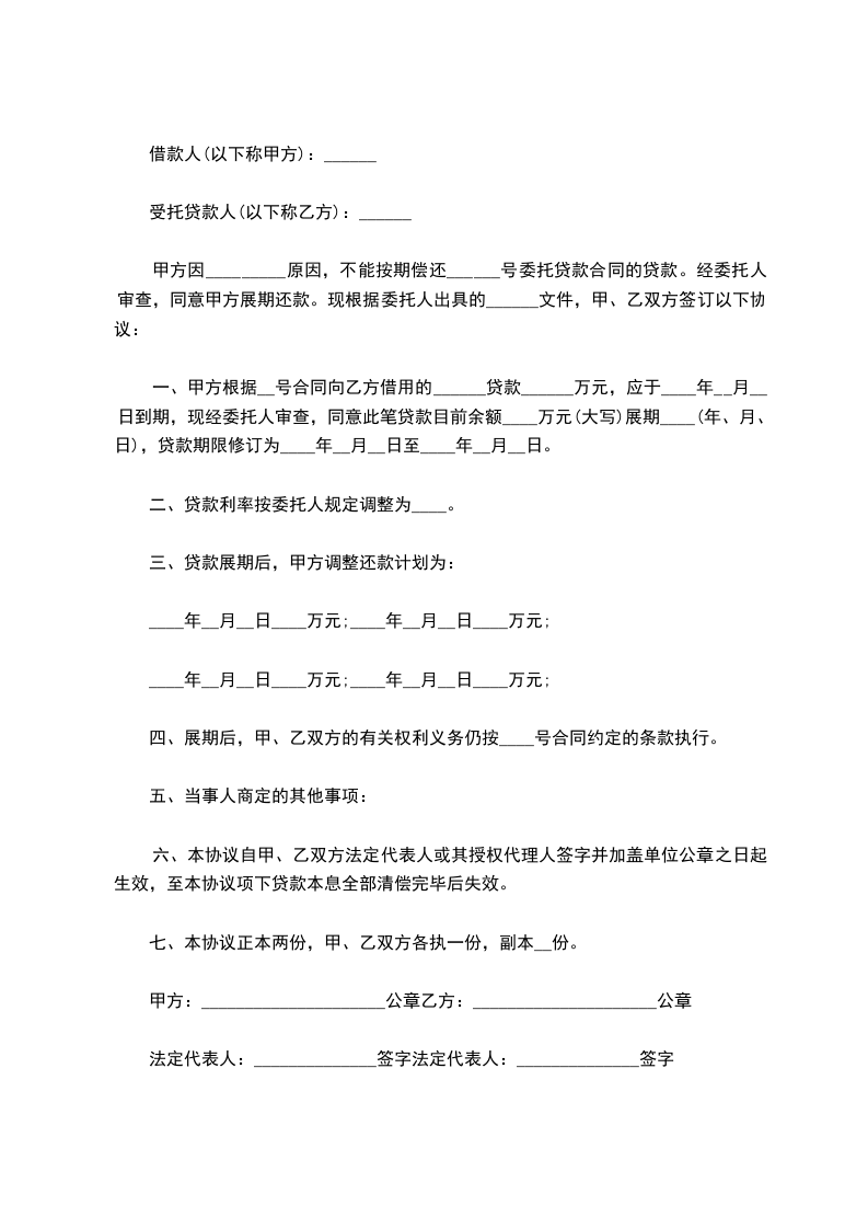 一、甲方根据__号合同向乙方借用的______贷款______万元,应于____年__月__日到期,现经委托人审查,同意此笔贷款目前余额____万元(大写)展期____(年、月、日),贷款期限修订为____年__月__日至____年__月__日。