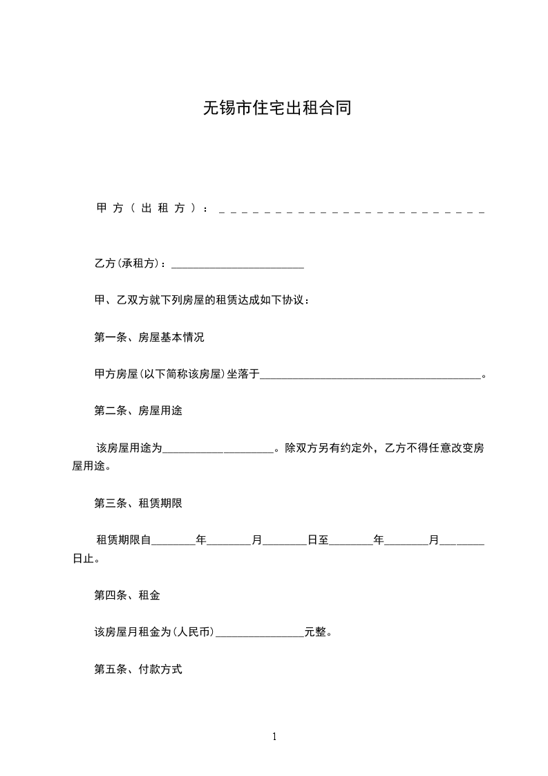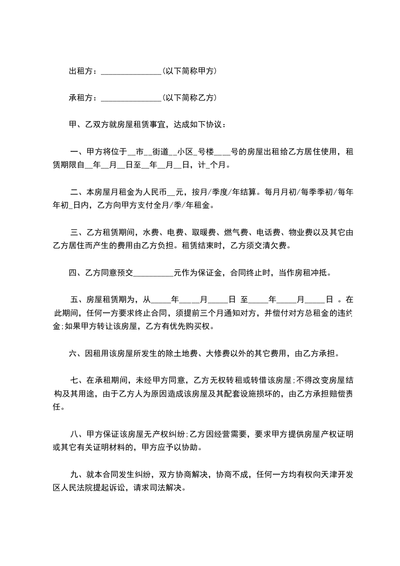 一、甲方将位于__市__街道__小区_号楼____号的房屋出租给乙方居住使用,租赁期限自__年__月__日至__年__月__日,计_个月。