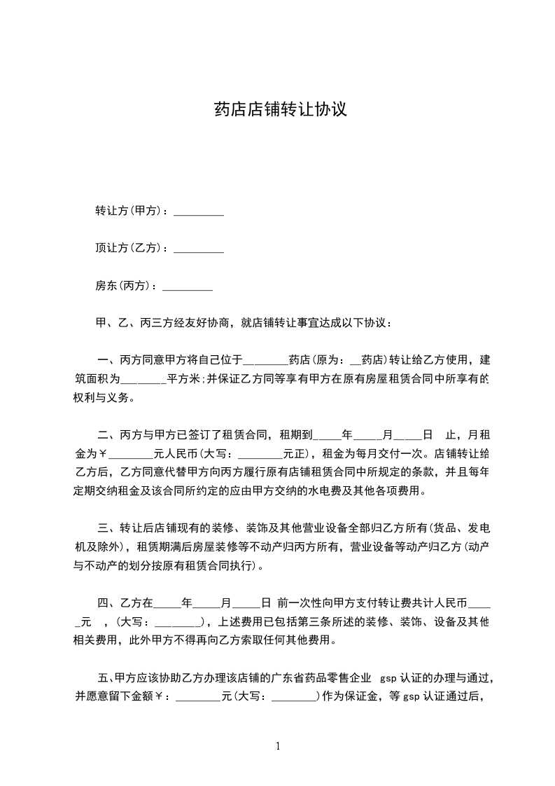 一、丙方同意甲方将自己位于________药店(原为:__药店)转让给乙方使用,建筑面积为________平方米;并保证乙方同等享有甲方在原有房屋租赁合同中所享有的权利与义务。
