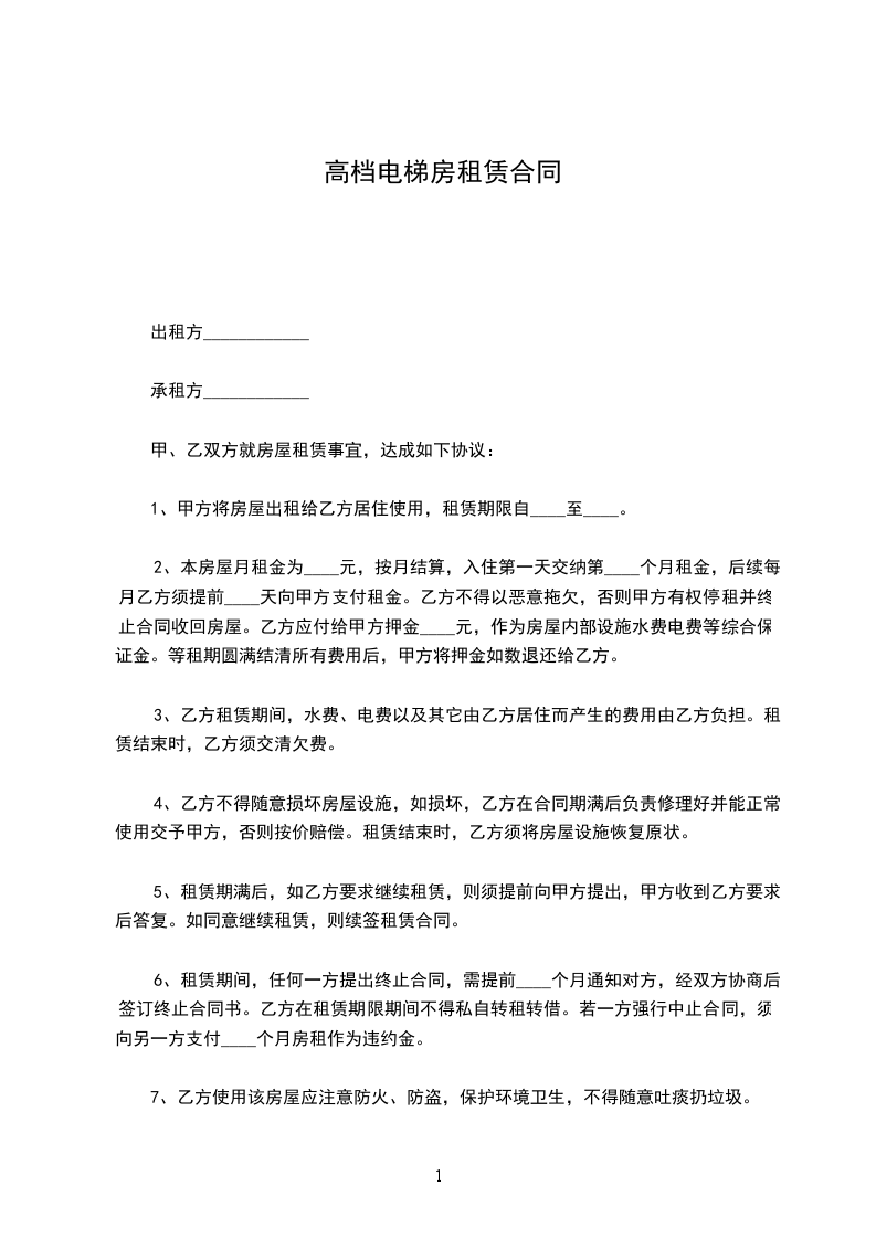 6、租赁期间,任何一方提出终止合同,需提前____个月通知对方,经双方协商后签订终止合同书。乙方在租赁期限期间不得私自转租转借。若一方强行中止合同,须向另一方支付____个月房租作为违约金。